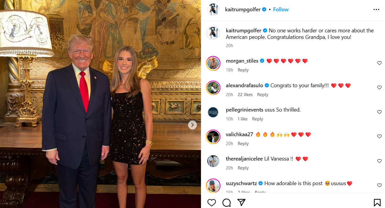 حرصت حفيدة الرئيس الأميركي دونالد ترامب، كاي، على التواجد في الصفوف الأمامية للعائلة في مركز مؤتمرات مقاطعة بالم بيتش، حيث أعلن جدّها الفوز في الانتخابات الرئاسية لعام 2024. وقفت إلى جانب والدها، دونالد ترامب الابن، ورمقت جدّها بنظرة فخر متجدّد. فبالنسبة لها "لا أحد يعمل بجدّ أكثر أو يهتم بالشعب الأميركي أكثر منه"، كلمات عبّرت عنها قبيل إعلان النتيجة النهائية للسباق الرئاسي في حسابها الشخصي على "إنستغرام".
