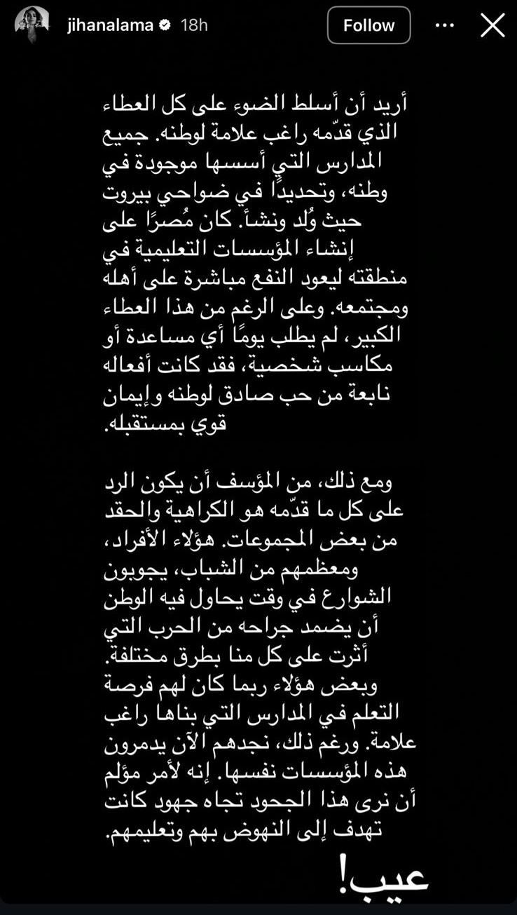 وعلّقت جيهان علامة للمرة الأولى على الهجوم الذي واجههه زوجها، عبر خاصية القصص المصورة في إنستغرام، فكتبت: "أريد أن أسلط الضوء على كل العطاء الذي قدّمه راغب علامة لوطنه. ‏جميع المدارس التي أسّسها موجودة في وطنه، وتحديداً في ضواحي بيروت، حيث ولد ونشأ. كان مصرّاً على إنشاء المؤسسات التعليمية في منطقته ليعود النفع مباشرة على أهل مجتمعه".