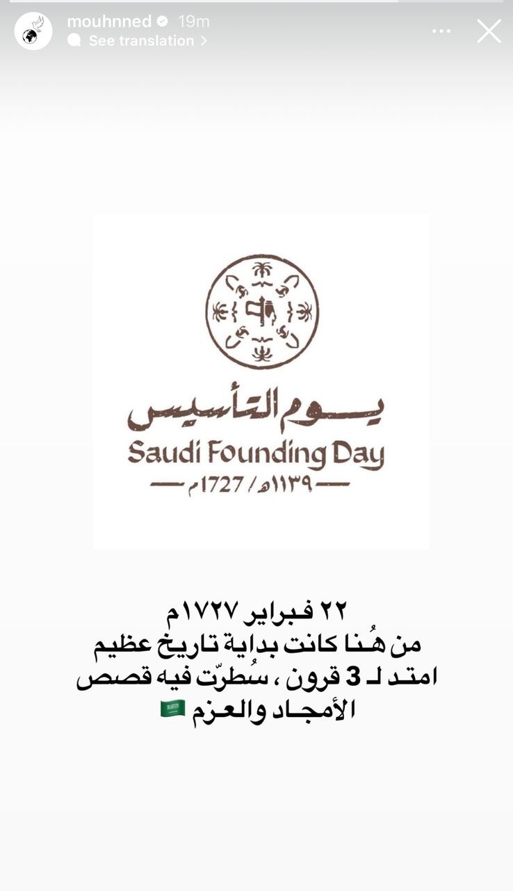 وكتب الممثل السعودي مهنّد الحمدي عبر خاصّية القصص المصوّرة في "إكس": "22 شباط (فبراير) من هنا كانت بداية تاريخ عظيم امتدّ لـ 3 قرون، سطّرت في قصص الأمجاد والعزم".