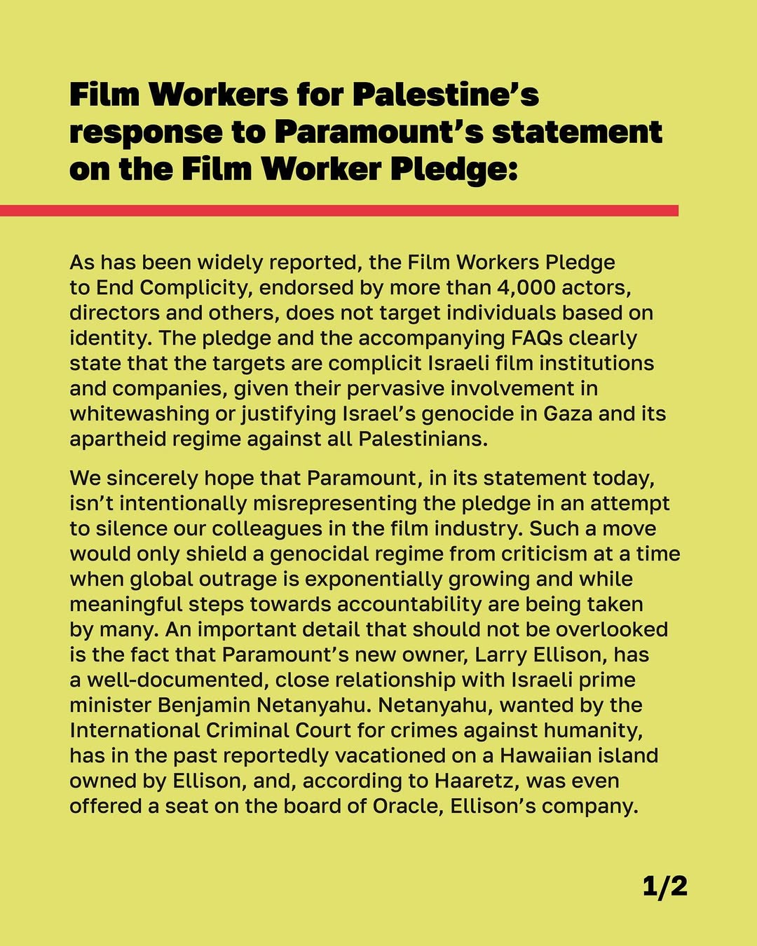 وقررت "باراماونت" أن تكون أول استديو كبير يواجه حراك "عمال السينما من أجل فلسطين"، في بيان نقلته "رويترز" عنها: " "لا نتفق مع الجهود الأخيرة لمقاطعة صانعي الأفلام الإسرائيليين. إن إسكات الفنانين المبدعين الأفراد بناءً على جنسياتهم لا يعزز الفهم أو يدعم قضية السلام. نحن بحاجة إلى مزيد من المشاركة والتواصل، لا أقل".