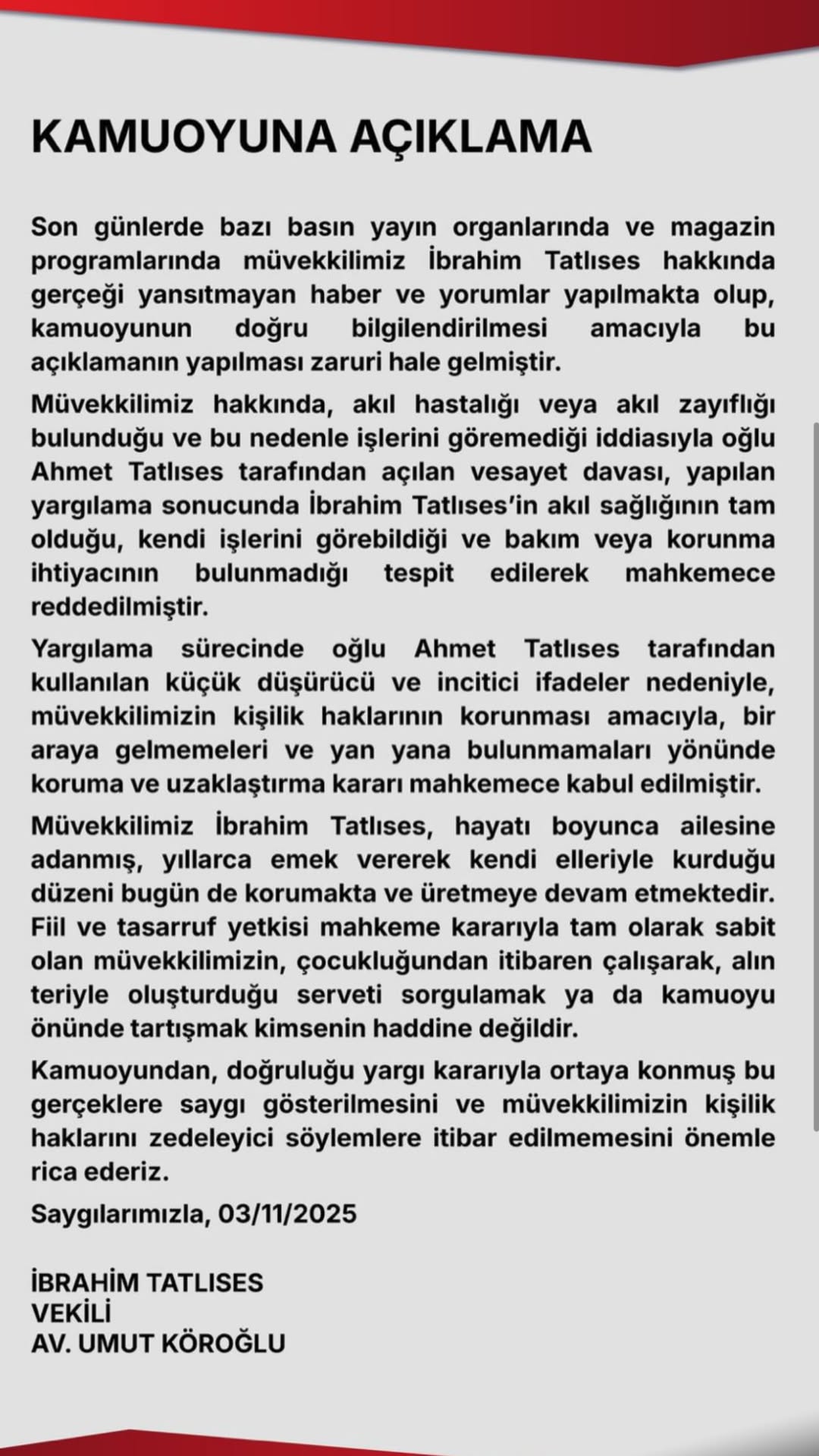 أما محامو الفنان إبراهيم تاتليس، فأصدروا بياناً خطياً نفوا فيه ما تداولته بعض وسائل الإعلام حول "تدهور حالته العقلية"، مؤكدين أنّ "موكّلهم يتمتع بكامل الأهلية القانونية في تصرّفاته، وإنّ أي تشكيك في قدرته أو في طريقة إدارته لأمواله لا يستند إلى أساس من الحقيقة".