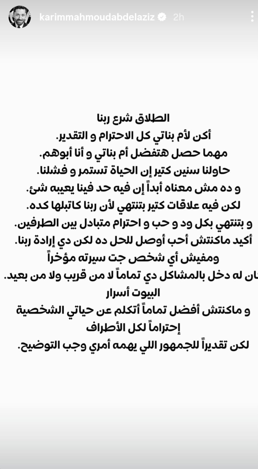 وقال كريم في بيانه الرسمي: "الطلاق شرع الله، وأكنّ لأم بناتي كل الاحترام والتقدير. مهما حدث، ستظلّ أم بناتي، وأنا سأظلّ والدهنّ. حاولنا طويلاً أن تستمر حياتنا معاً، لكننا فشلنا، وهذا لا يعني أن أحداً منا مخطئ، فالكثير من العلاقات تنتهي بمشيئة الله، وتنتهي بكل حب واحترام متبادل".