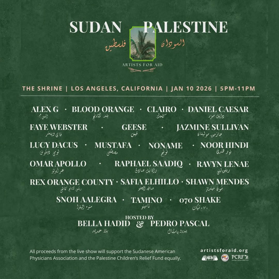 ويشارك في الحفل عدد كبير من الفنانين، على أن تُوجَّه جميع العائدات لدعم صندوق الإغاثة للأطفال الفلسطينيين وجمعية الأطباء السودانيين الأميركيين بالتساوي.