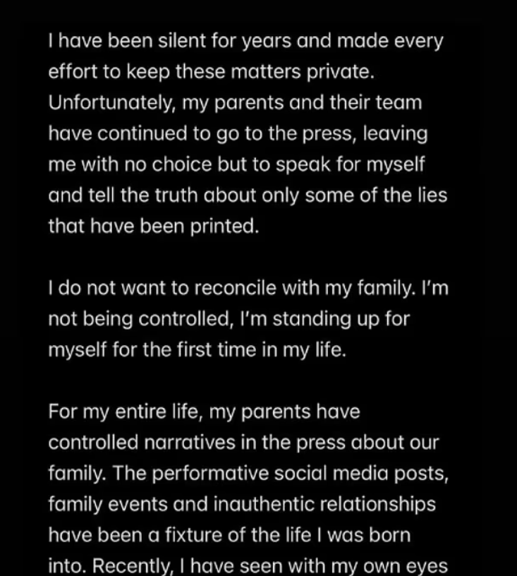 كما كشف أن ضغوطا مورست عليه قبيل الزفاف للتوقيع على التنازل عن حقوق استخدام اسمه، معتبرا أن ذلك كان سيؤثر عليه وعلى زوجته وأطفالهما مستقبلًا. وأضاف أن والديه "تحكما لسنوات في السردية الإعلامية للعائلة"، وأن "الحب داخل العائلة يُقاس بعدد المنشورات على وسائل التواصل الاجتماعي".
