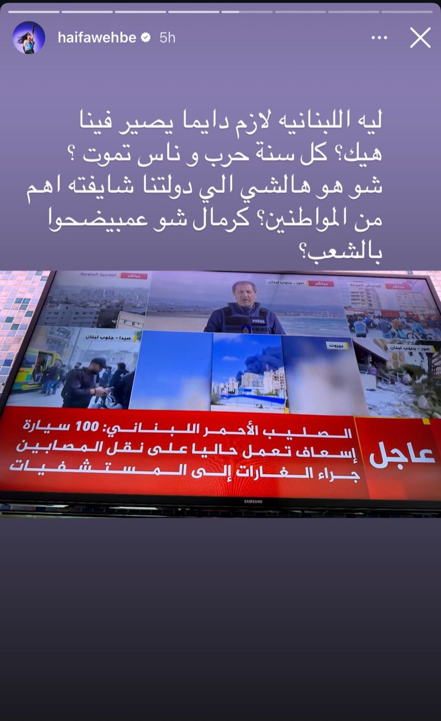 بدورها، شاركت الفنانة اللبنانية هيفا وهبي صرخة عبر خاصية القصص المصورة في "إنستغرام": "لماذا يجب أن يحدث هذا دائماً في لبنان؟ كل عام حرب وموتى… ما هذا الذي تراه دولتنا أهم من المواطنين؟ من أجل ماذا يُضحّى بالشعب؟".
