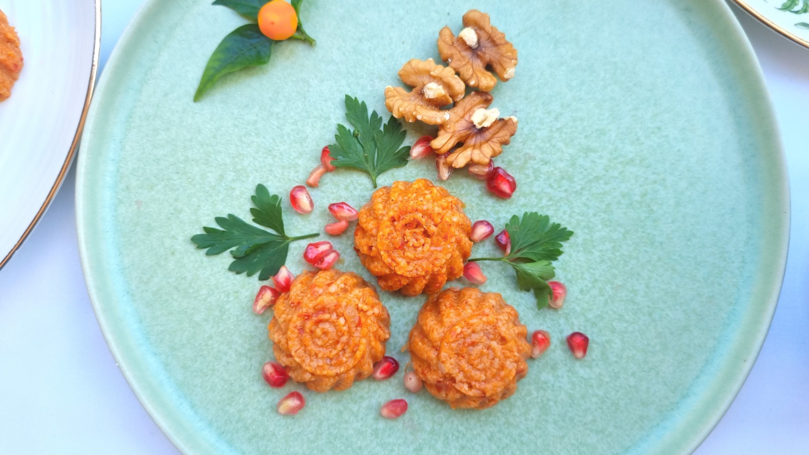 - إضافة البصل المقلي ومعجون الفليفلة الحلوة والحارة ومعجون الطماطم ودبس الرمان والثوم المهروس، مع الاستمرار بالدعك، حتى تتشكل عجينة يسهل تشكيلها.