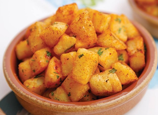 1. نضع كمية كبيرة من الزيت في قدر على الموقد، ثم نضع مكعبات البطاطس ونقليها لمدة 10 دقائق حتى تصبح ذهبية.