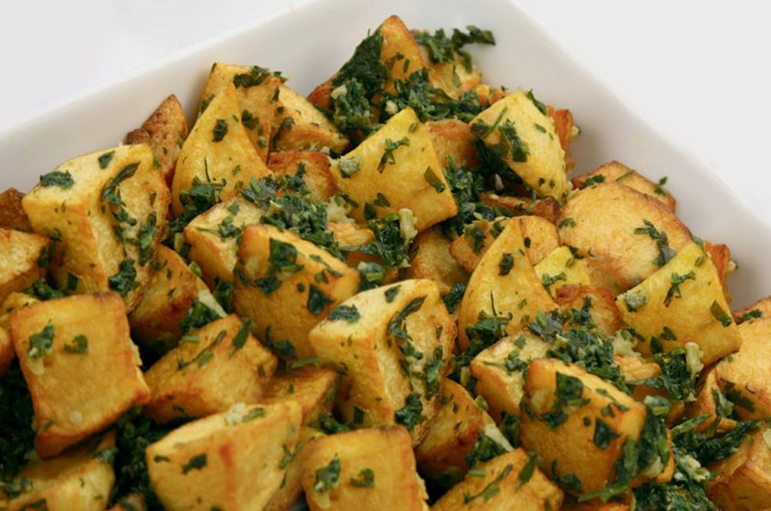 5. نوزّع مزيج الكزبرة فوق البطاطس، ثم نسكب عصير الليمون ونحرّكها جيداً حتى تتجانس النكهات.