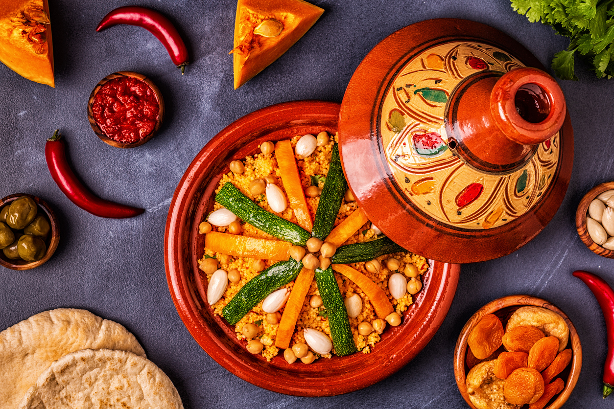 - الطاجن المغربي: هو من المأكولات الشعبية المعروفة في المغرب الذي يشتهر بلذته. وهو عبارة عن قدر مصنوع من الفخار الذي يحافظ على القيم الغذائية للأصناف المطبوخة فيه. ويتكوّن هذا الطبق من اللحم أو الدجاج المطبوخ مع الخضار.