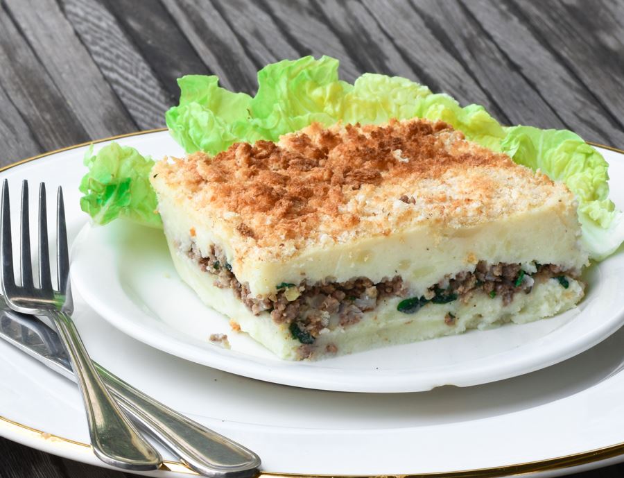 - دهن صينية خاصة بالفرن بقليل من الزيت النباتي، ومن ثم تغطية قعرها بنصف كمية البطاطا، وتوزيع حشوة اللحم فوقها، ثم تغطيتها بطبقة أخرى من البطاطا.