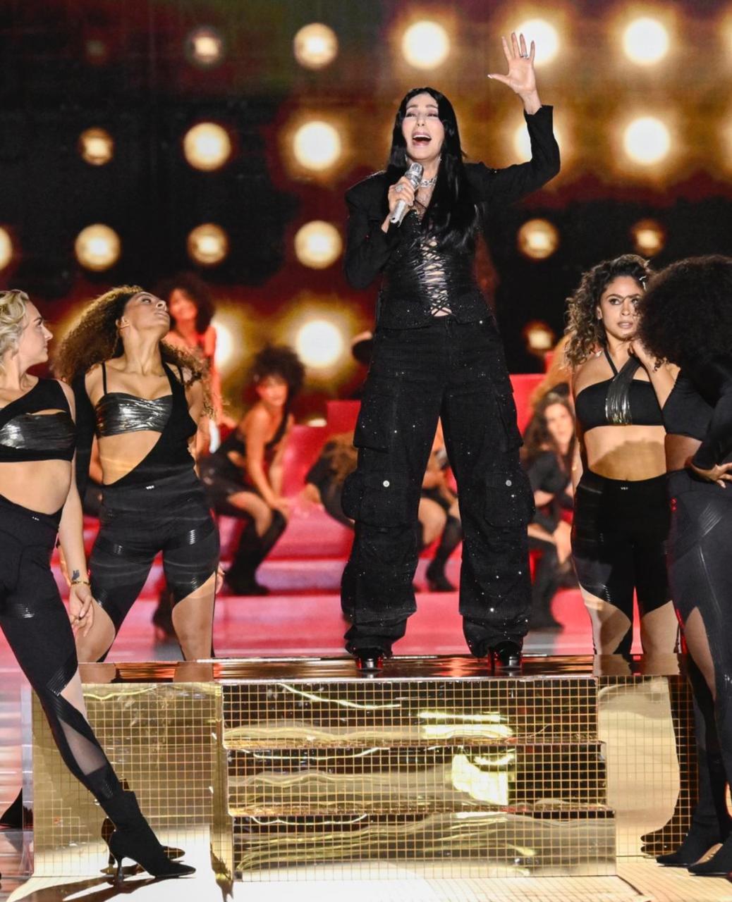 شير التي أحيت العرض، اختارت إطلالة عصريّة من مجموعة ربيع وصيف 2025 للألبسة الجاهزة من علامة The Attico، شملت "بودي" شبكي، وسترة طويلة دخانيّة اللون، نسّقتهما مع سروال منفوخ من الجلد المرقّع بأكثر من لون: رمادي، باذنجاني، ودخاني، وهو بتفصيل سحّاب معدني في أسفل كلّ قدم، كما حدّدت خصرها بحزامٍ من الجلد مزيّن بإكسسوارات معدنيّة. كذلك، انتعلت شير حذاءً من الجلد الأسود بكعبٍ عالٍ عريض، وتزيّنت بمجوهرات Messika مرصّعة بالألماس.