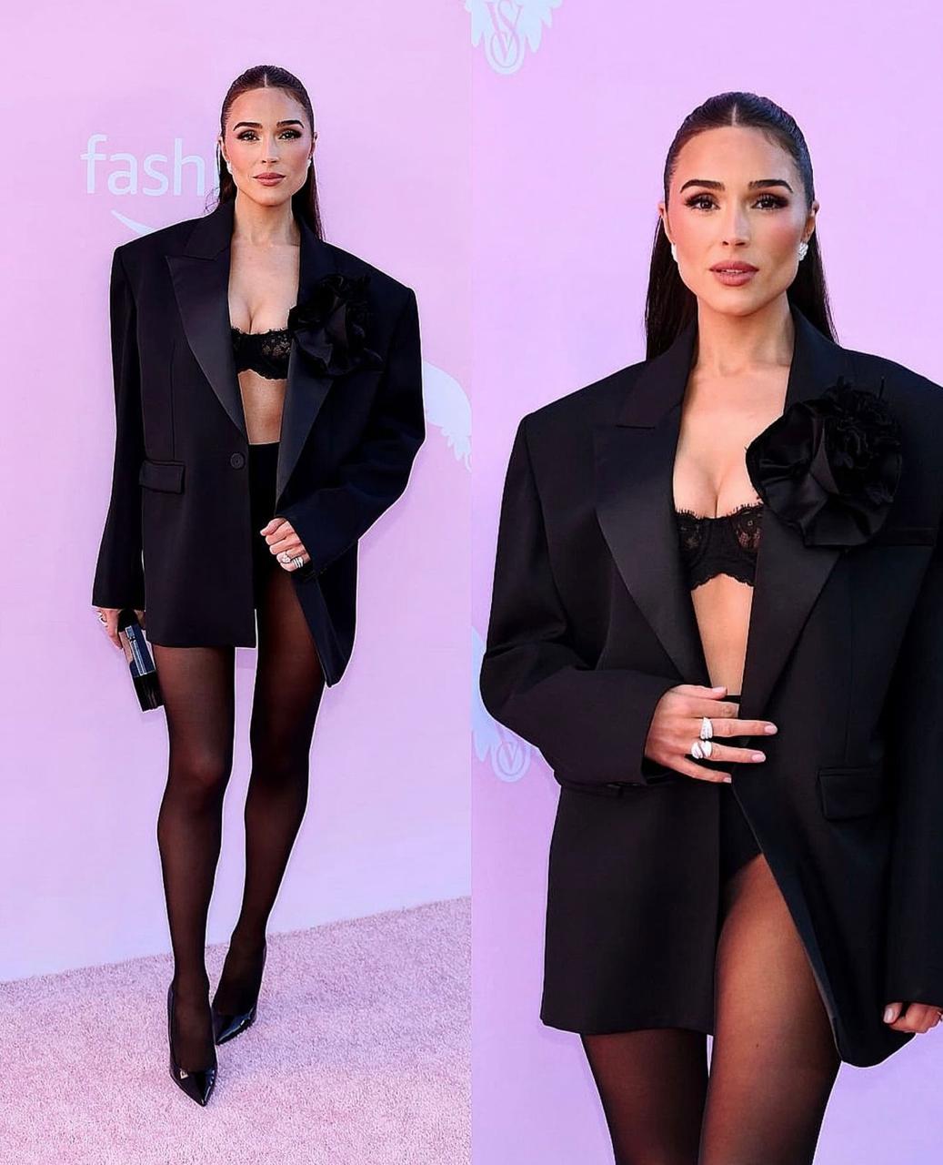 أوليفيا كولبو بدت أنيقة رغم النمط الجريء الذي اعتمدته، حيث ارتدت سروالاً قصيراً جداً أسود اللون مع حمّالة صدر من الدانتيل من اللون نفسه، نسّقتهما مع سترة سوداء كلاسيكيّة واسعة وطويلة تميّزها ياقة ساتينيّة، كما تزيّنت بمجوهرات مرصّعة بالألماس، وانتعلت كندرة مدبّبة سوداء لمّاعة مع جوارب نسائيّة داكنة، وحملت حقيبة مخلب بلون كندرتها.