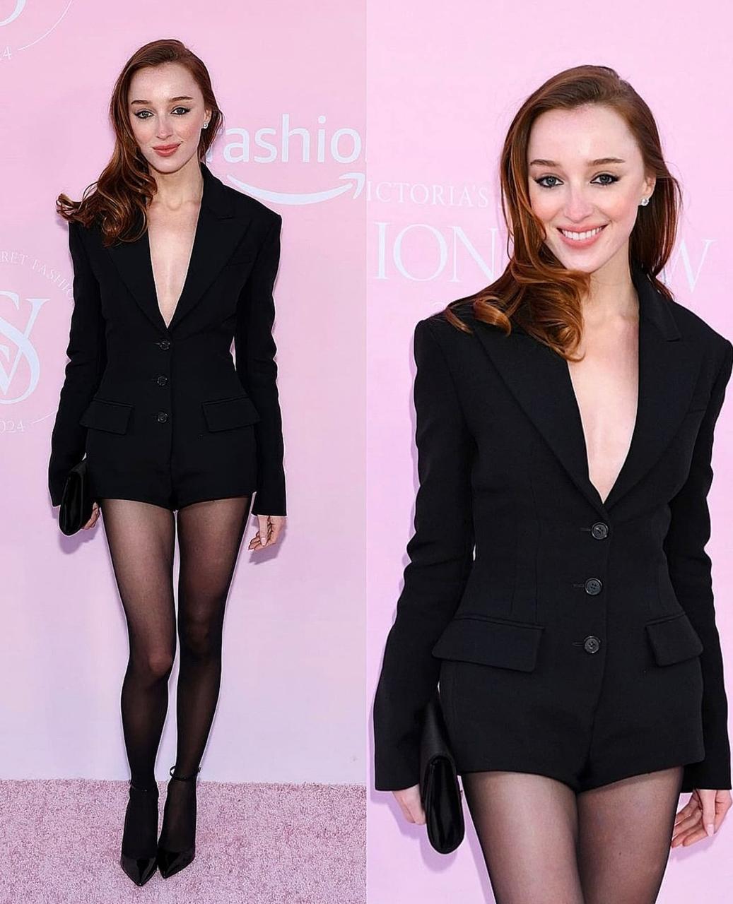 الممثلّة الإنكليزيّة فيبي دينيفور تأنّقت بسروال قصير أسود اللون مع سترة مكشوفة الصدر ومنحوتة الخصر مع كُمّيْن طويليْن وتفصيل جيبيْن وأزرار كبيرة من مجموعة الألبسة الجاهزة لربيع وصيف 2025 من Michael Kors، أقرنتهما مع جوارب نسائيّة سوداء، وحقيبة مخلب من اللون نفسه، كما انتعلت كندرة مدبّبة بلون زيّها.