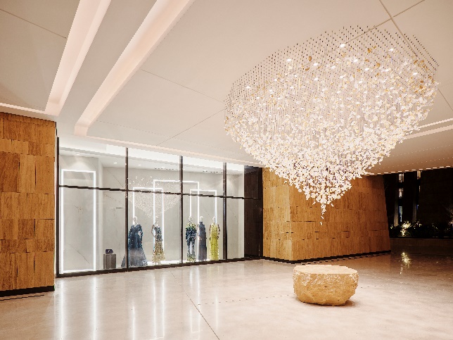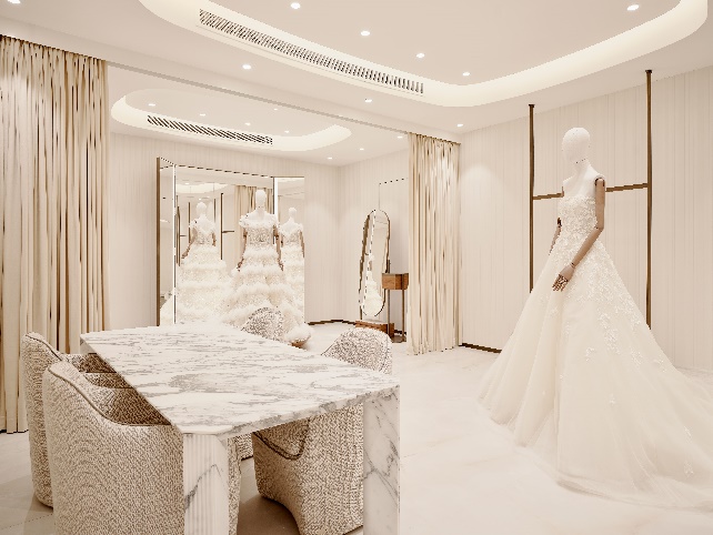 ينبثق جوهر إيلي صعب من المظهر الخارجي للبوتيك ومن الداخل المليء بالسحر، فهو مصمّم ومفروش حصرياً بواسطة دار ELIE SAAB. من الأرضيات الرخامية إلى السجاد الفخم، ويغمر طيف اللون الأبيض البوتيك الواسع، ما يسمح لكل غرفة بالتميّز. تعكس الإضاءة الدافئة لمسات فاخرة على النحاس وخشب البلوط، بالإضافة إلى المرايا المزيّنة بأحرف ELIE SAAB المجرّدة، ما يضفي نغمة غنيّة وترحيبيّة مع التعبير عن جماليّة العلامة التجارية المميّزة.