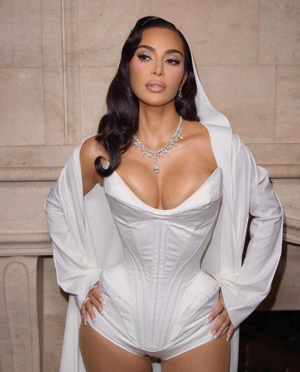كيم كارداشيان كانت الأكثر جرأة بين أختيها، حيث أنها ارتدت "بودي" أبيض بنمط ال "كورسيه" مزخرف وبدون حمّالات ينحت الجسم بتفصيل أربطة متشابكة معقودة من الخلف من تصميم قديم ل"موغلر" Mugler، وهو مقرون برداء واسع يلامس الأرض ذي كُمّين طويلين ومزوّد بغطاءٍ للرأس، كما تزيّنت بمجوهرات من البلاتين المرصّع بأحجار كبيرة من الألماس من "تيفاني أند كو" Tiffany & Co، وانتعلت كندرة من البلكسي الحيادي اللون مع جوارب نسائيّة من بلون البشرة.