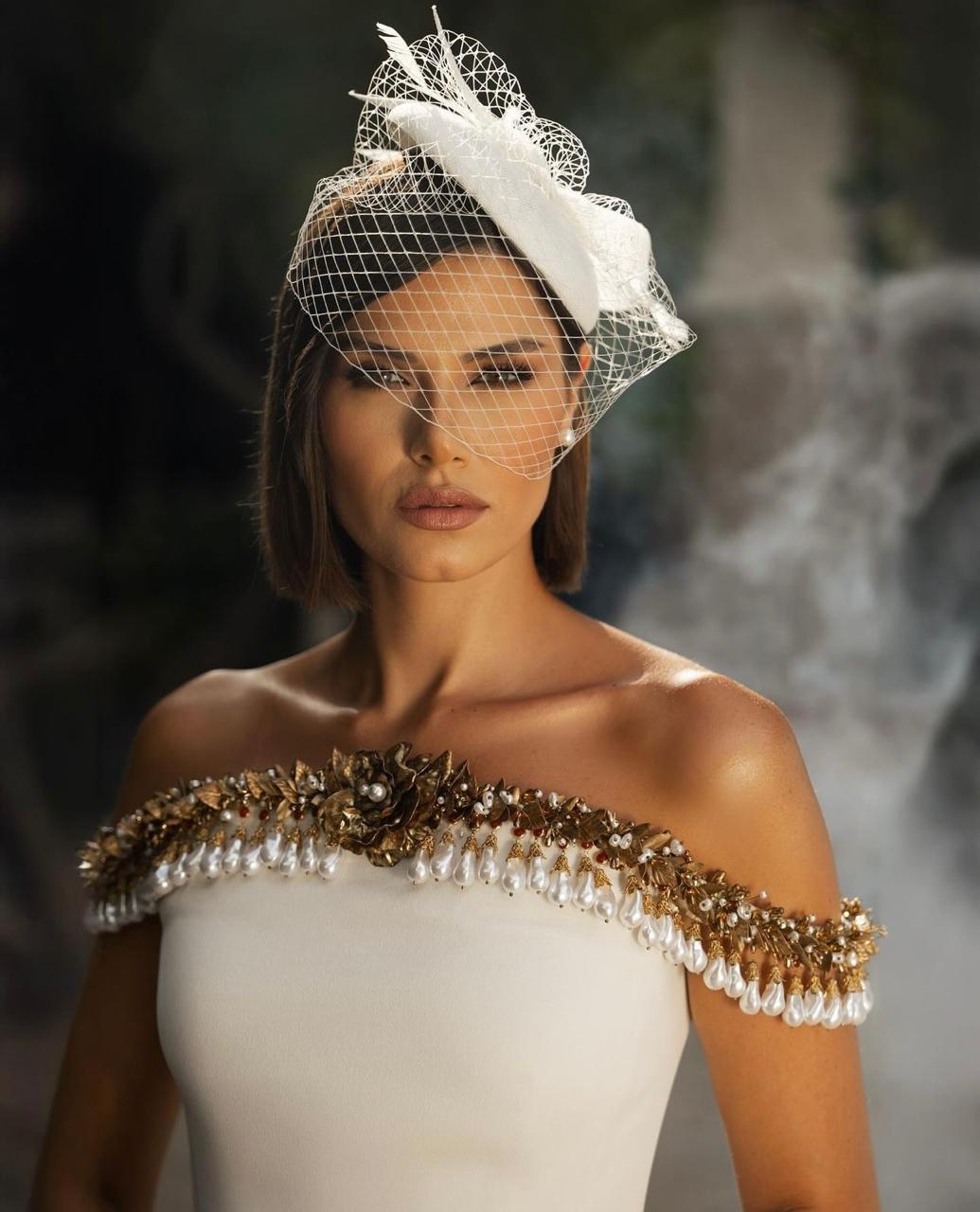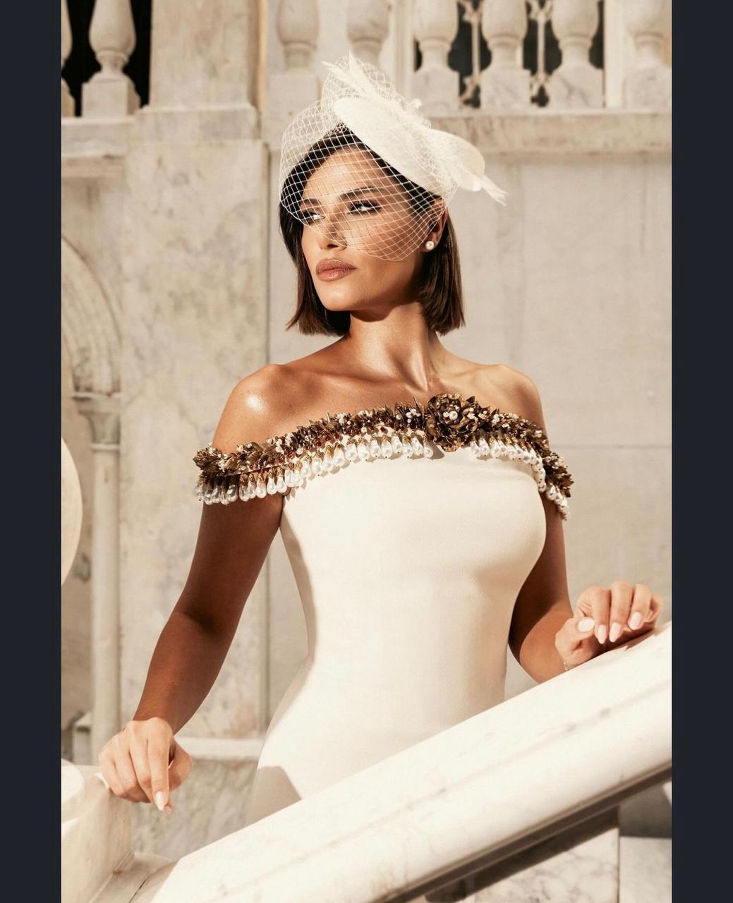 نبيلة المعروفة عادة بنمط أزيائها الكلاسيكيّة الأنيقة، اختارت ليومها المميّز فستاناً أبيض عاجياً بقصّة قصيرة على شكل حرف A، مكشوفة الكتفين، حيث تبرز التطريزات اليدويّة بالخرز الأبيض واللآلئ الكمثريّة الشكل، والتفاصيل المعدنيّة البرونزيّة المصمّمة على شكل أوراق الشجر. وتزيّنت بمجوهرات من البلاتين المرصّع بالألماس، وقرطي أذنين صغيرين من اللؤلؤ. كذلك، انتعلت نبيلة كندرة مدبّبة من الجلد الأبيض بكعبٍ رفيعٍ شاهق، واستبدلت الطرحة الطويلة بقبعة مع تفصيل من الشبك الأبيض يغطّي وجهها جزئياً.