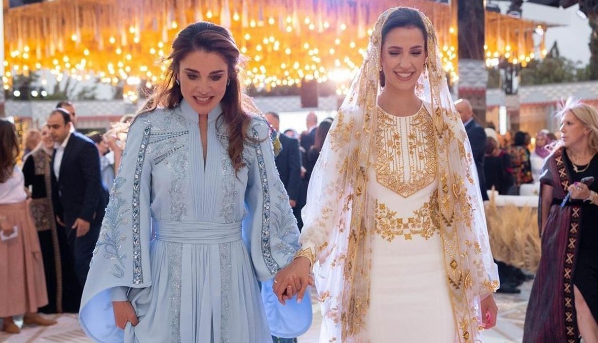 وأمّا الملكة رانيا، فقد بدت مشعّة باللباس التقليدي الأزرق اللون، الرائع مع الأكمام الواسعة والتنورة ذات الثنيات العريضة، رفعت نصف شعرها الى الأعلى مع فرق جانبي، كما أبرز المكياج جمال عينيها، تمّ استعمال النيود للشفاه. وقد جمعت الحفلة نساء العائلة كلّها.