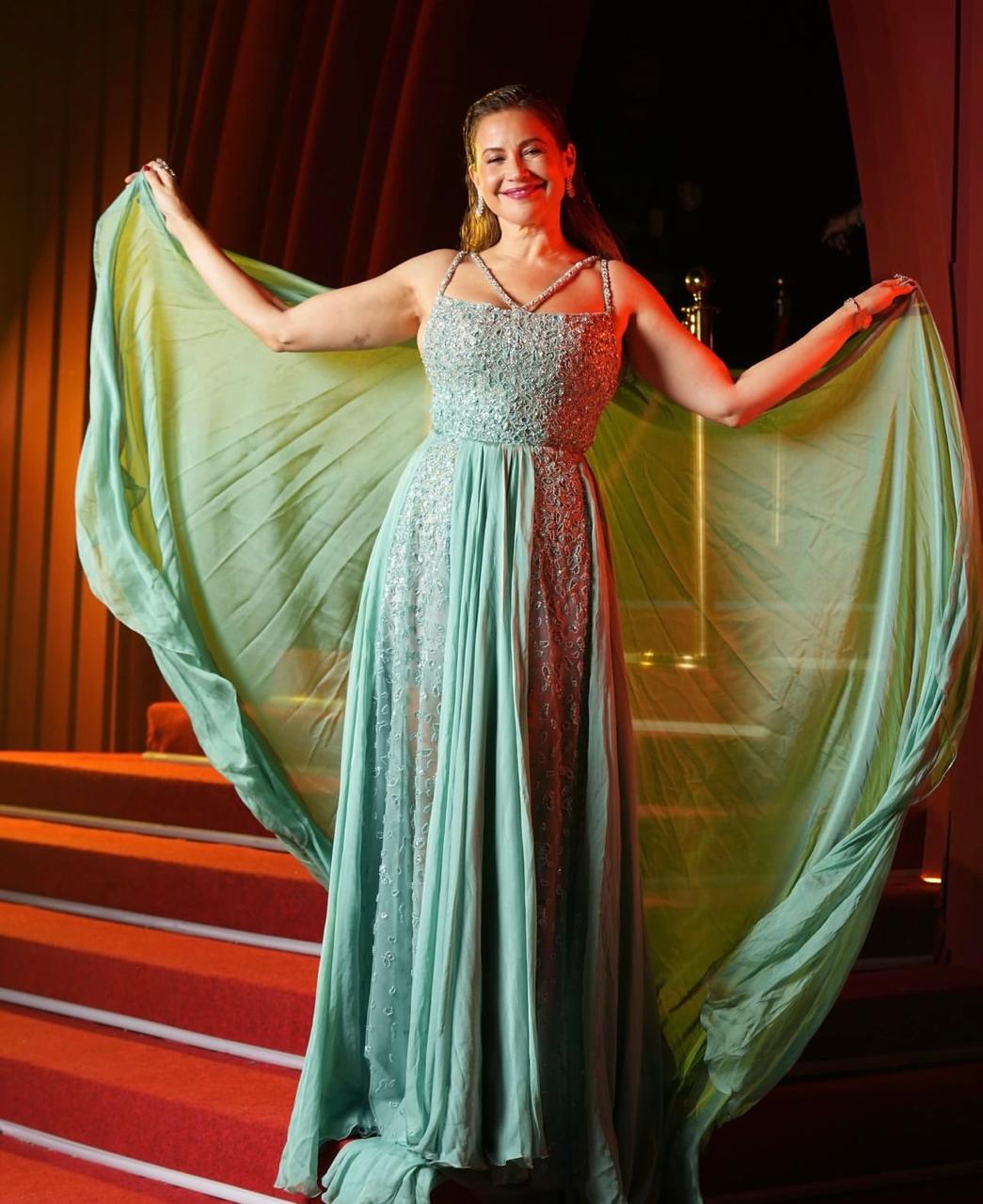 النجمة المخضرمة يسرا، أطلّت بتصميم مبهر باللون الأزرق النيلي من المبدع اللبناني-العالمي طوني ورد، وهو فستان طويل بقصّة تعانق الجسم، تميّز بتنّورة مطرّزة بالكامل بالخرز البرّاق وبتفصيل شق بحدود الركبتيْن. أمّا القسم العلوي فجاء بنمط الرداء الطويل الذي يلامس الأرض بكُمّيْن واسعيْن وتفصيل الزمزمة عند الصدر حيث تبرز فتحة عميقة على شكل حرف V. كذلك، تزيّنت يسرا بمجوهرات مرصّعة بالألماس، وانتعلت صندلاً بلون فستانها منمّقاً بالكريستال، وحملت حقيبة مخلب مكمّلة لزيّها ومزيّنة بأحجار السواروفسكي.
