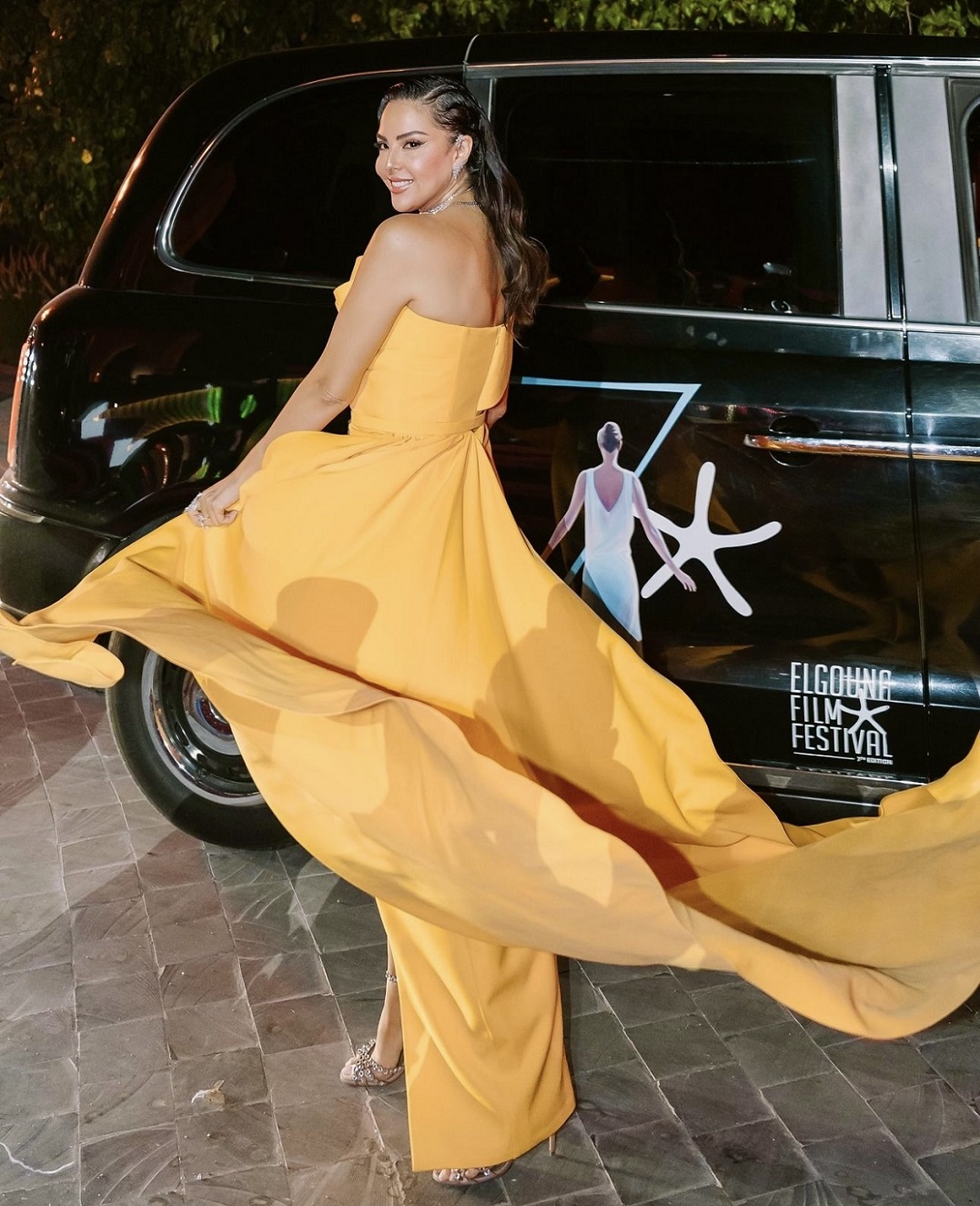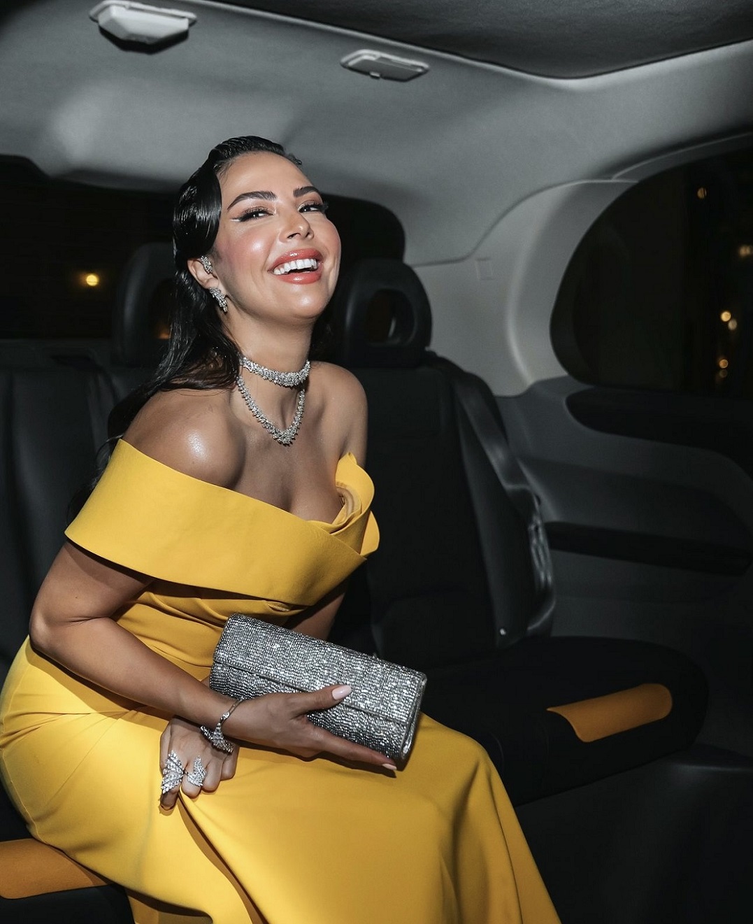 الممثلّة نينا مغربي لفتت الأنظار بتصميم آخر من نور فتح الله باللون الأصفر الحيوي، تميّز بقصّة طويلة تعانق الجسم، مكشوفة الكتفيْن مع خصر منحوت بنمط الزمزمة، وتفصيل شق طويل يكشف السّاق اليمنى، أقرنته مع حقيبة مخلب فضيّة برّاقة، وانتعلت صندلاً مفتوحاً منمّقاً بالكريستال، كما تزيّنت بمجوهرات من البلاتين المرصّع بالألماس من علامة "غلامور" Glamour Jewellery.