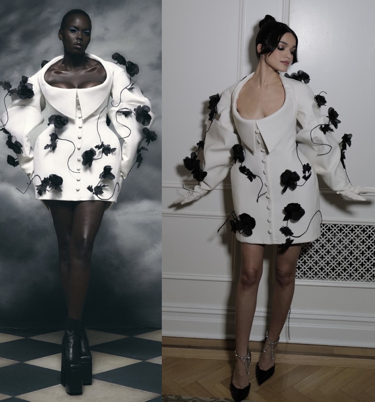 بدورها راشيل زيغلر تأنّقت بتصميم مبهر باللون الأبيض مزيّن بورود سوداء كبيرة من مجموعة الألبسة الجاهزة لربيع وصيف 2025 للمبدع هاريس ريد Harris Reed، تميز بقصّة قصيرة منفوخة، وخصر منحوت بتفصيل أزرار صغيرة. كما أن ياقة الفستان العميقة مثنيّة على شكل قبّة قميص عريضة وتكشف أعلى الصدر. أما كُمّي الثوب الطويليْن فمجعّديْن ومنفوخيْن من الأعلى. وقد تزيّنت زيغلر بمجموعة مجوهرات عصريّة مرصّعة بالألماس من "إيفا فيهرين" Eva Fehren، وانتعلت كندرة سوداء مدبّبة وتفصيل سلاسل مزيّنة بالكرسيتال تعانق كاحل القدميْن من علامة "جيمي شو" Jimmy Choo، ووضعت في يديْها قفّازيْن بلون فستانها.