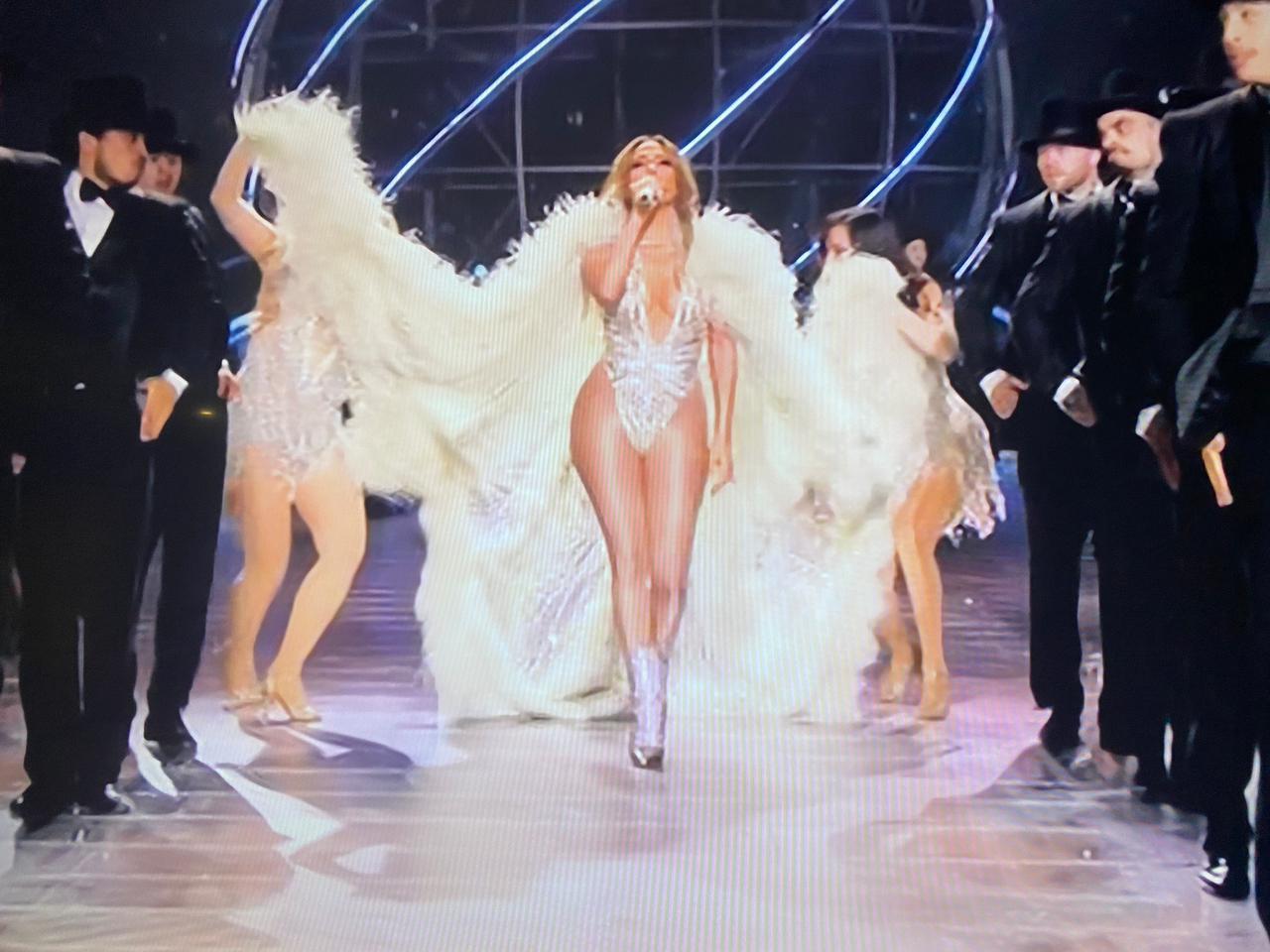 تألقت جينيفر لوبيز بلباس استعراضي فضي مطرّز بالترتر والكريستال البرّاق، وهو مقرون مع رداء طويل من الريش الأبيض، كما انتعلت جزمة قصيرة منمّقة بأحجار الراين