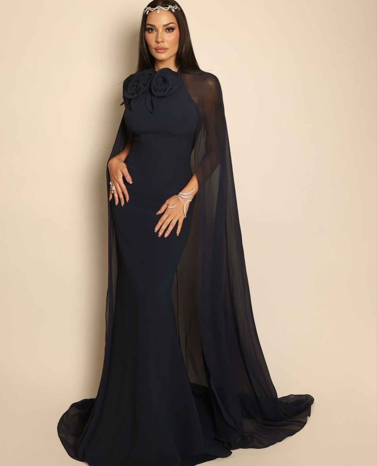 وقد تألّقت نادين بفستانٍ طويل من الكريب الأسود ينحت قوامها الممشوق بقصّة حورية البحر ونمط "هالتر نك" في القسم العلوي منه. كما أن الفستان مقرون برداء كتفيْن طويل من الشيفون يغلّف الذراعيْن، ومزيّن عند الصدر بوردتيْن كبيرتيْن من لونه. كذلك، تزيّنت نادين بمجوهرات تمّت صياغتها من البلاتين المرصّع بالألماس من علامة "يبرم" Yeprem شملت "تيارا" توّجت رأسها، وسوار مخلب منحوت بأسلوب فنّي، وخاتم ضخم.