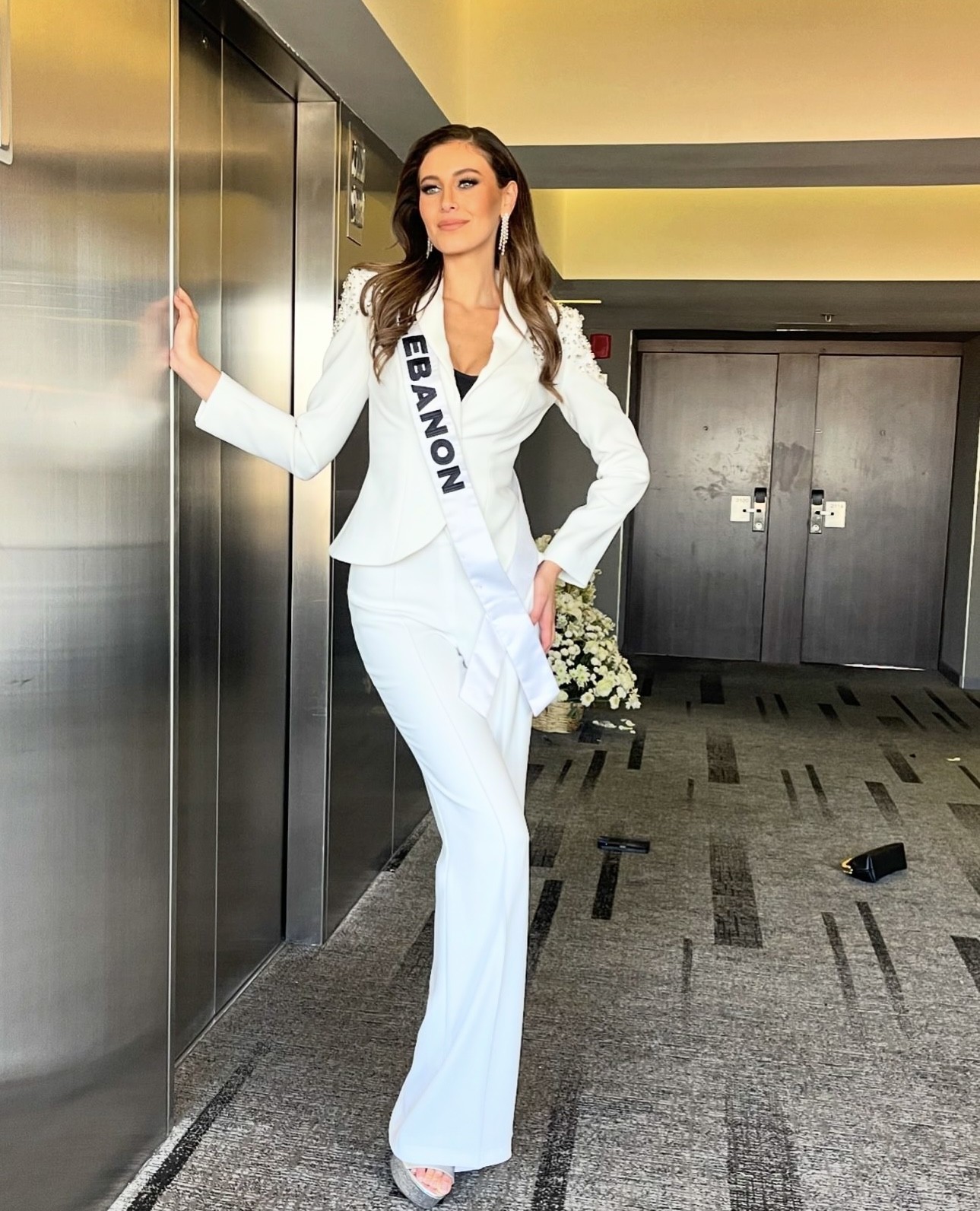 ومن إطلالتها أيضاً، بدلة باللون الأبيض، وهو اللون الذي يرمز إلى النقاء كالثلج الذي يكلّل سفوح جبال لبنان في الشتاء وهو رمز لجمال وطبيعة البلاد. كما يشير اللون الأبيض إلى السلام الذي يسعى إليه لبنان من خلال تحقيق العدالة والاستقرار والوئام بين مكوّناته.