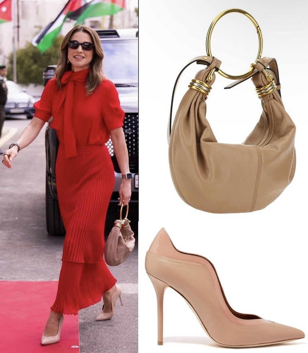 وقد تألّقت الملكة رانيا باللون الأحمر وهو أحد الألوان المفضّلة لديها ويلائمها بامتياز، حيث اختارت تنّورة من النمط المحبوك المطّاط معتدلة الطول، تعانق جسمها، ومؤلفة من طبقتين بنمط الثنيات الصغيرة Ariana Skirt من علامة "ألتوزارا" Altuzarra، أقرنتها مع قميص أحمر بكُمّين طويلين وقبّة عالية مع ربطة معقودة على شكل فراشة Pussy Bow Blouse. كذلك، تزيّنت الملكة بمجوهرات وحلي عصريّة، وانتعلت كندرة مدبّبة من الجلد اللمّاع بلون البيج الفاتح Penelope Point-Toe Pumps من علامة "مالون" Malone Souliers، وحملت حقيبة من الجلد بلون كندرتها Small Bracelet Hobo Bag من علامة "كلوي" Chloe.