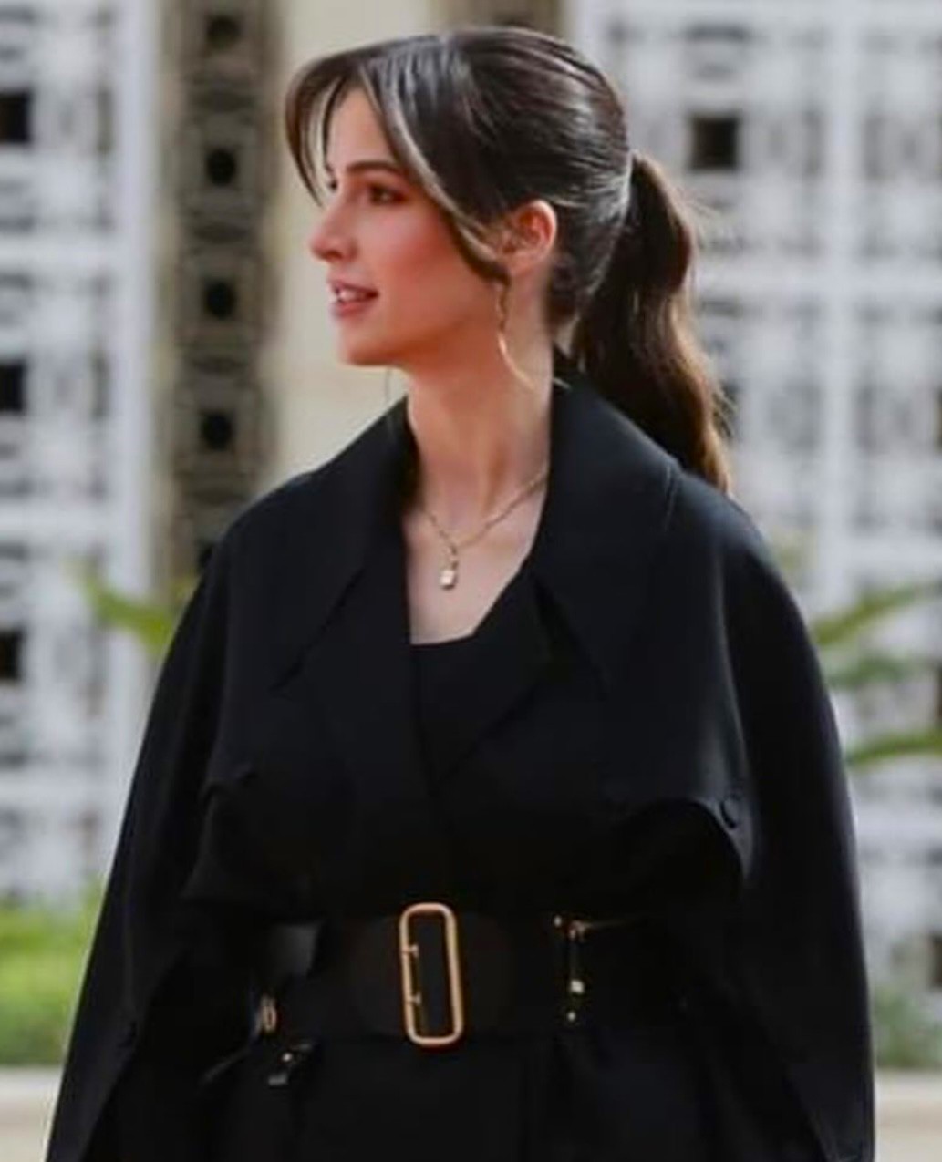 بدورها الأميرة رجوة بدت أنيقة باللون الأسود الذي يبرز تناقضاً جميلاً مع سحنتها البيضاء، حيث ارتدت فوق ملابسها معطفاً مضادّاً للمطر محدّد الخصر بحزامٍ من "ديور" Dior، أقرنته مع حقيبة يد من الجلد الأسود Goji Small Woman Bag من علامة "جيل ساندر" Jil Sander. كما تزيّنت بمجوهرات ماسيّة ناعمة.
