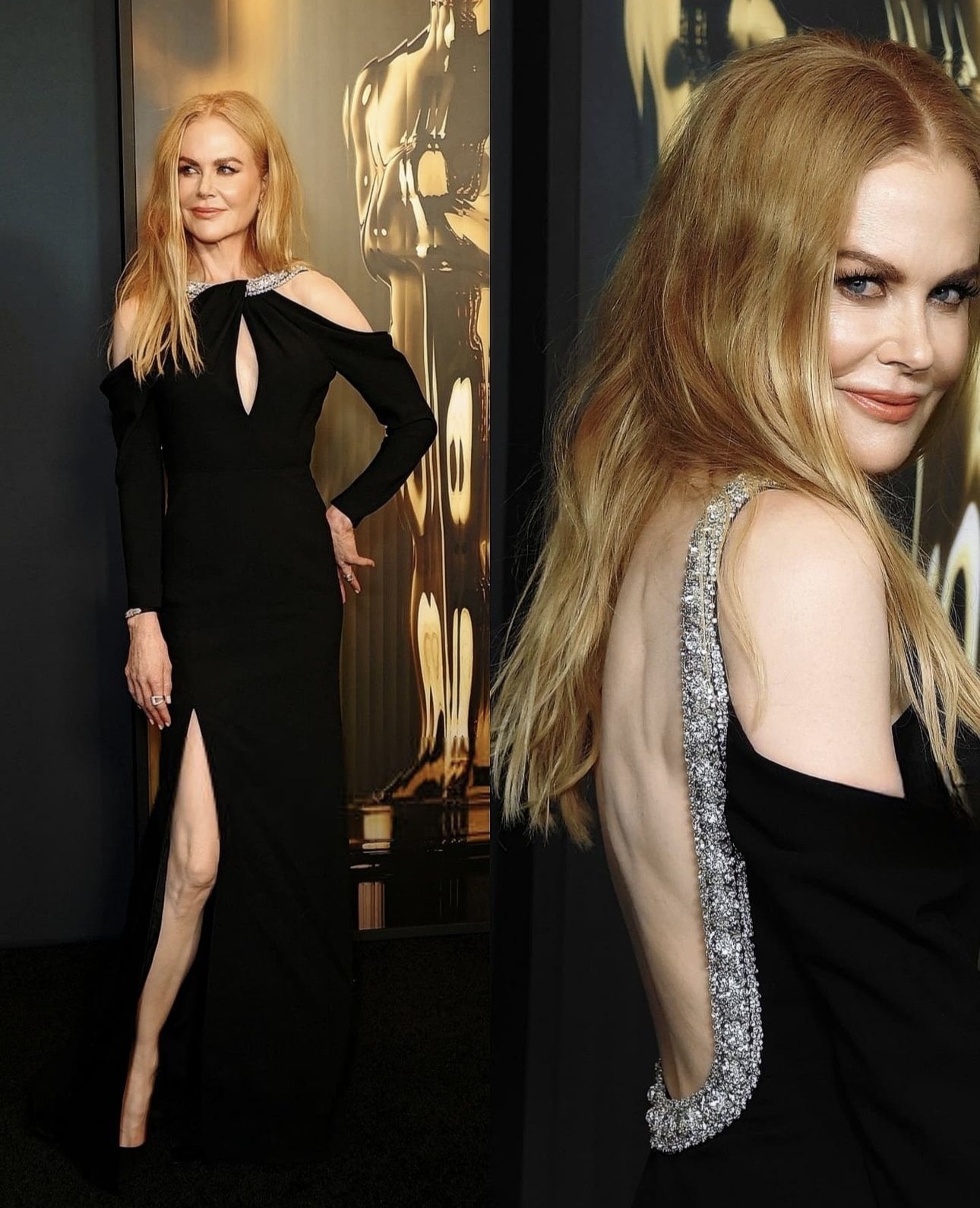 وكانت النجمة الأستراليّة الصهباء، قد خطفت الأنظار بإطلالتها الراقية في حفل الجوائز الفخريّة The Governors Awards، وذلك بفستانٍ أسود منسدل مكشوف الكتفين والظهر وعلى طول السّاق اليسرى، وهو بكمّين طويلين ومطرّز بالترتر والخرز الكريستاليّ البرّاق حول العنق وفتحة الظهر من علامة "سيلين" Céline، وانتعلت كندرة سوداء مدبّبة. كما تزيّنت بمجوهرات من البلاتين المرصّع بالألماس.