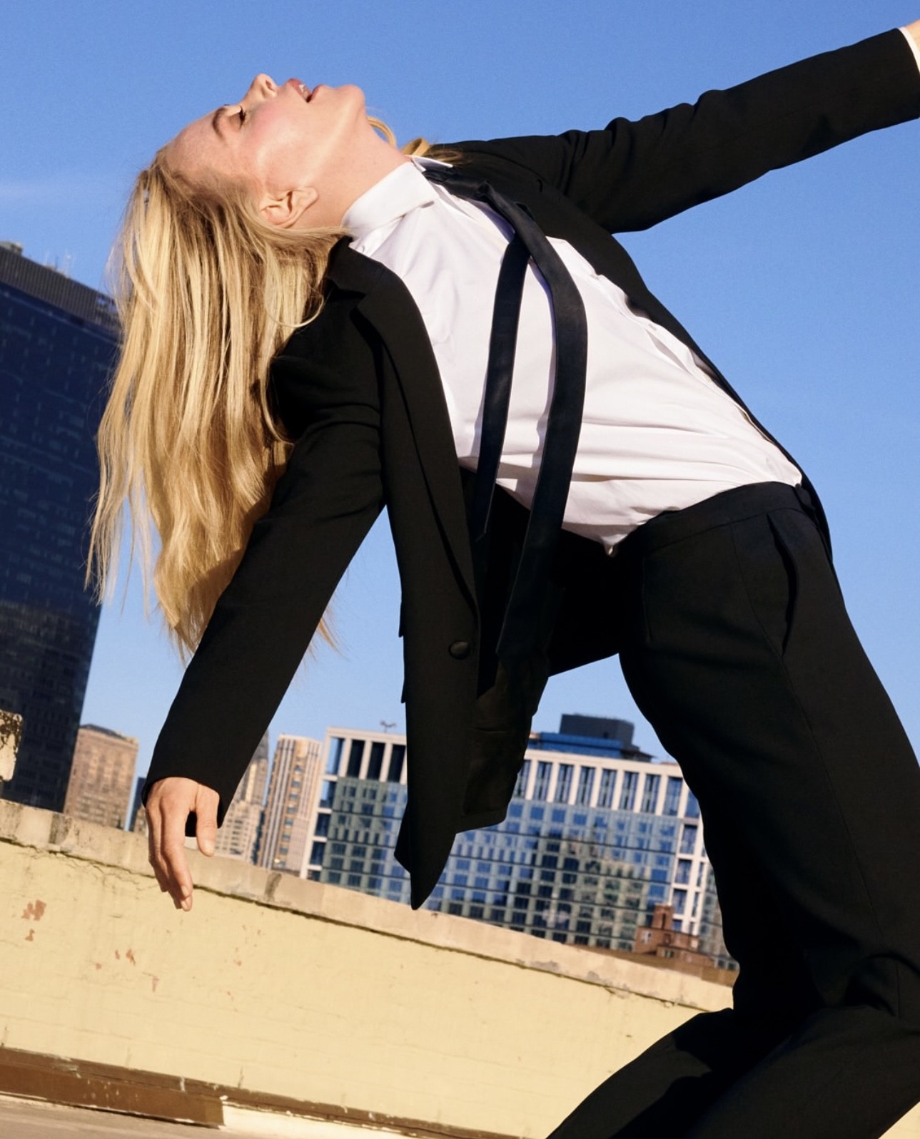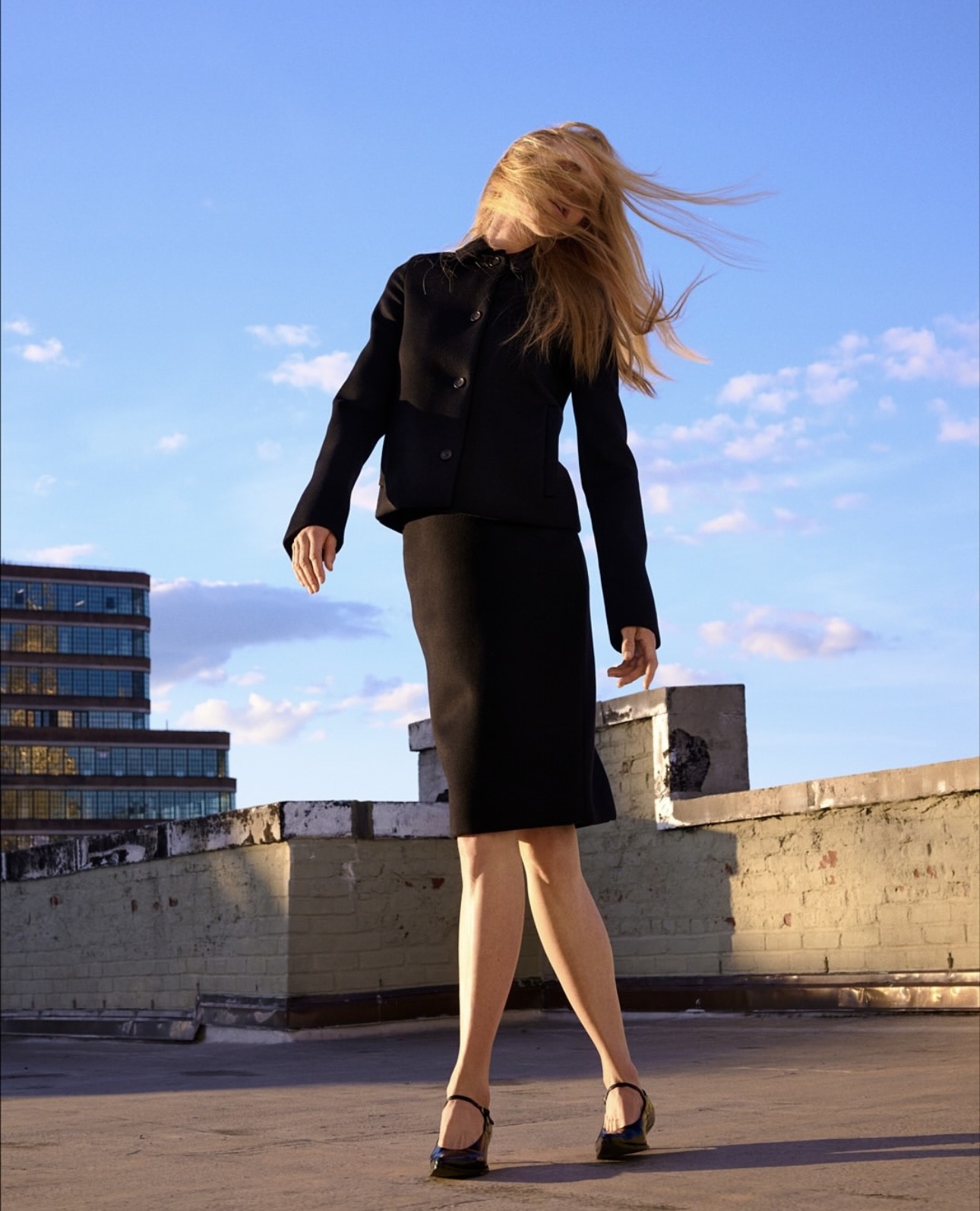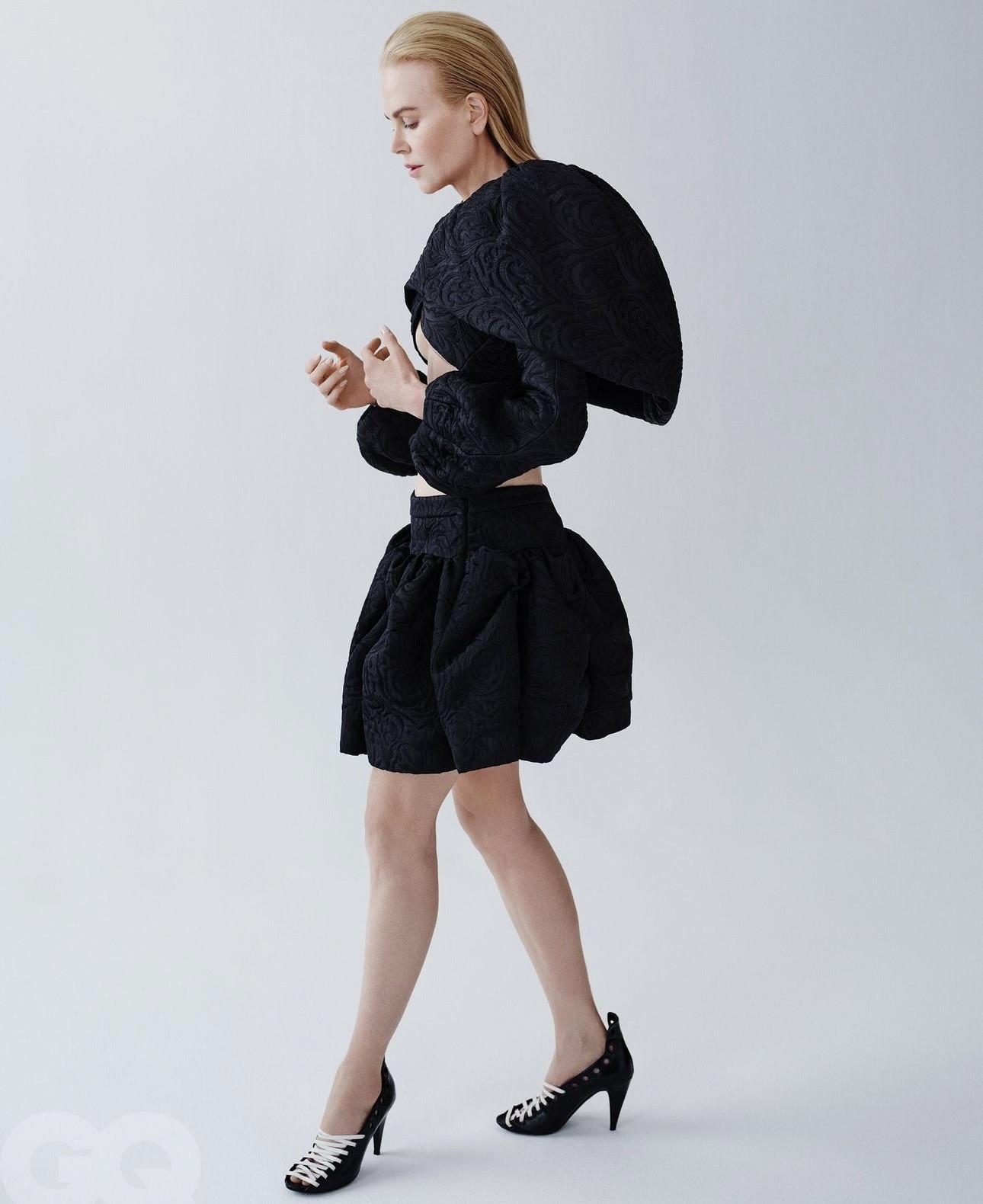 وفي إحدى الصور بعدسة فيليكس كوبر في مجلّة GQ البريطانيّة، تأنقت كيدمان بتنّورة وسترة قصيرة ومنفوخة من نسيج الكريب ذات الزخرفات البارزة، وانتعلت كندرة سوداء بتفصيل أربطة بيضاء.