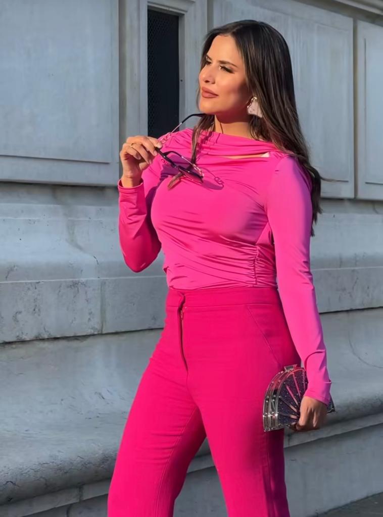 سيّدة الأعمال السّعوديّة ندى باعشن تأنٌّقت بسروال بلون الماجينتا مع قميص فوشيا بتفصيل الزمزمة وكُمّيْن طويليْن، ومشقوق عند أعلى الصدر من علامة Victoria Beckham، وحملت حقيبة مخلب من تصميم Marzook، وزيّنت أذنيْها بقرطيْن مميّزيْن من Apoa، كما وضعت نظّارّات شمسيّة كبيرة من Valentino.