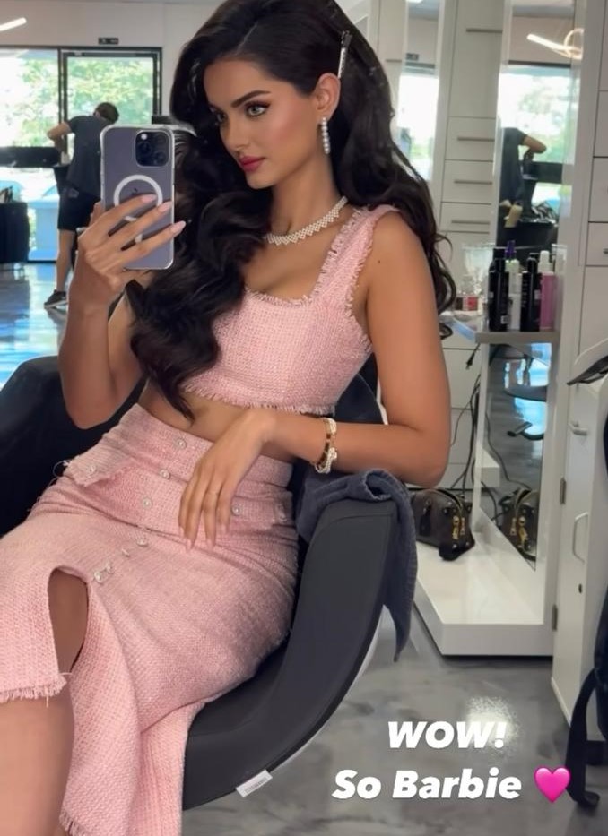 مصمّمة المجوهرات المغربيّة مريم الأبيض بدت فاتنة بفستان بلون الماجينتا مطرّز بالكريستال البرّاق من المصمّم اللبناني-العالمي زهير مراد مكشوف عند الصدر والخصر والساقيْن، وتزيّنت بمجوهرات لافتة منJewelry Ashaha، وحملت حقيبة يدّ مطعمّة بالكريستال من Aristocrate Maison، أقرنتها مع صندل من النمط نفسه. وفي إطلالة ثانية مستوحاة أيضاً من "باربي"، اختارت مريم الأبيض تنّورة و"توب" من التويد الوردي النابض من علامة Self-Portrait، وحملت حقيبة يد من الجلد بلون زيّها نسّقتها مع مضخّة بمنصة ضخمة كلاهما من Maison Valentino، كما تزيّنت بمجوهرات رائعة من تصميمها الخاص من مجموعة Mimia Leblanc متوافرة لدى Voyageur Jewelry.