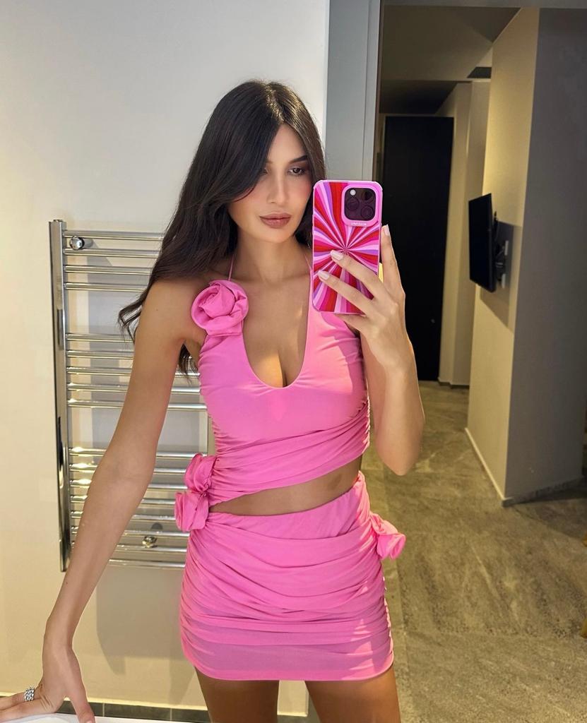 الفاشينيستا اللبنانيّة أليس عبد العزيز والتي تعشق اللون الوردي، بدت كدمية الباربي بفستانٍ قصيرٍ جداً بلون الفوشيا، وهو مميّز بقصّة تعانق الجسم من دون كُمّيْن بنمط "هالتر نك"، وتفصيل الزمزمة، ومزيّن بورود كبيرة، كما أنّه مكشوف عند الصدر والبطن والظهر من Magda Butrym بالتعاون مع علامة FWRD.