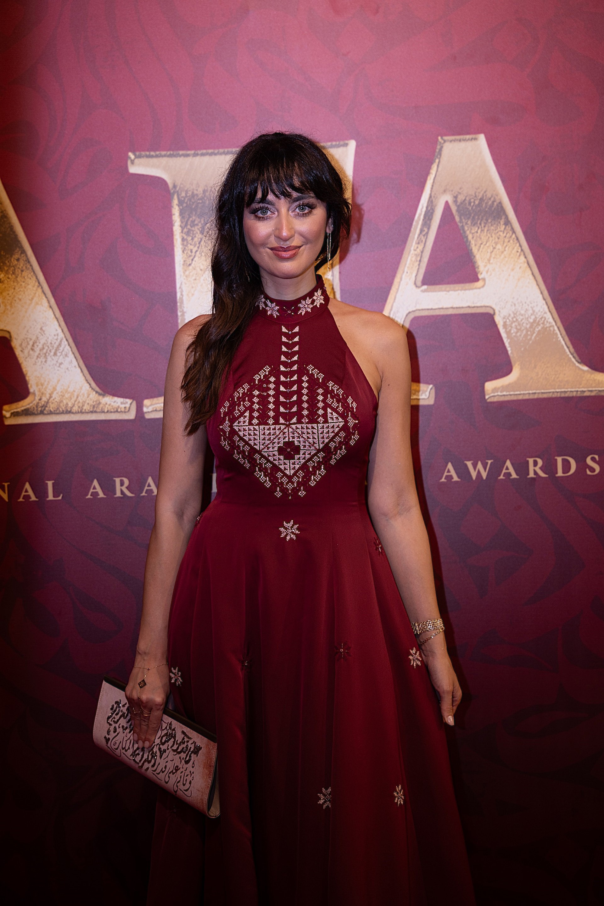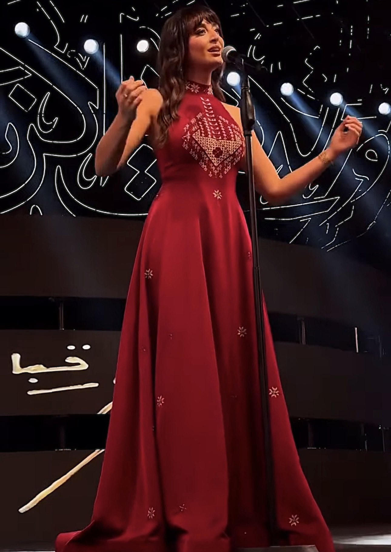فايا يونان بأناقة البرغندي واللمسة التراثية الفلسطينية من ريما دحبور (صور وفيديو)
