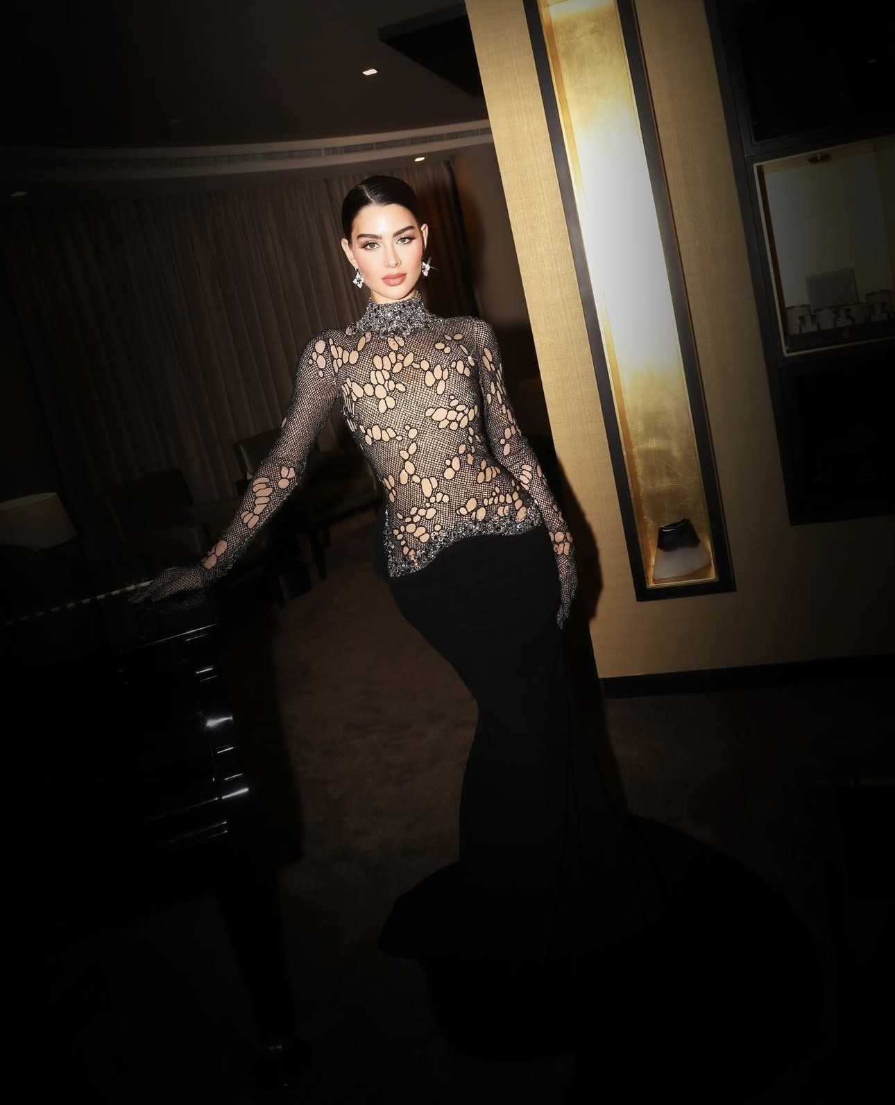 تميّز فستان روان بتوليفة تجمع بين "بودي" مخرّم ذي قبّة عالية وكُمّين طويلين، وتنورة سوداء بتفصيل الطيات المزمومة حول الخصر، وقصّة طويلة تعانق الجسم وتتسّع من الأسفل على شكل ذيل طويل. كما أن الفستان منمّق بالترتر والخرز الكريستالي البرّاق عند الياقة وحول الخصر. كذلك، تزيّنت روان بمجوهرات تمّت صياغتها من البلاتين المرصّع بالألماس من "روبرتو كوين" Roberto Coin.