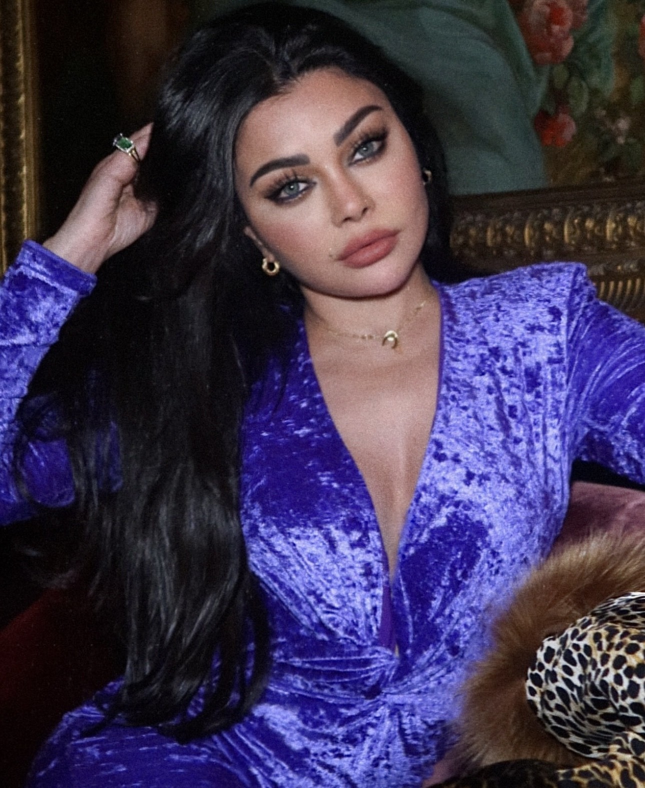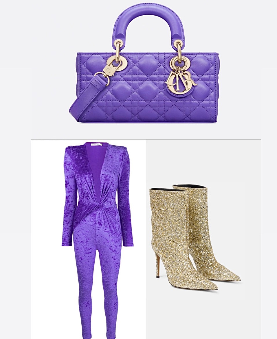 وفي إطلالة سابقة، بدت هيفاء فاتنة باللون البنفسجي الداكن، حيث ارتدت "جمبسوت" من المخمل بتفصيل مزمزم في أسفل ياقة الصدر المكشوف على شكل حرف V Twisted Crushed-Velvet Jumpsuit in Purple من علامة Amen، أقرنته مع سترة ضخمة من الفرو باللون البني المتوسط مبطن بنمط جلد الفهد. كذلك، تزيّنت هيفاء بمجوهرات من الذهب الأصفر من بينها خاتمين كبيرين أحدهما مرصّع بالزمرد والثاني بالياقوت. كما حملت أيقونة الموضة حقيبةSmall Lady D-Joy Bag Purple Cannage بقيمة 4,056$ من علامة "ديور" Dior بلون ال"جمبسوت"، وانتعلت جزمة قصيرة مدبّبة باللون الذهبي البرّاقGlitter Ankle Boots in Gold من Alexandre Vauthier.