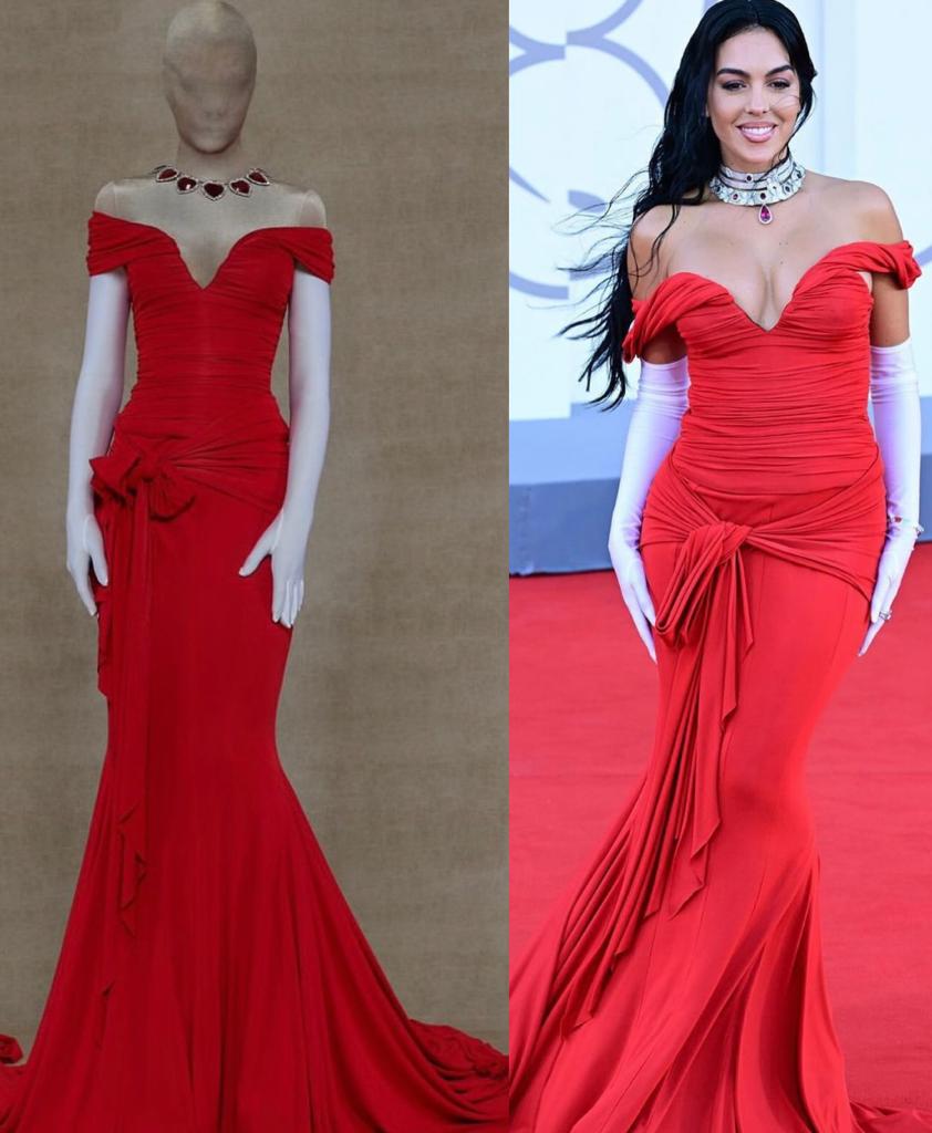 وقد تأنّقت جورجينا بفستان أحمر طويل يعانق جسمها ويتسع من الأسفل، مكشوف الكتفيْن وبتفصيل الزمزمة وخصر محدّد بحزام من نسيج الفستان نفسه، وهو ثمرة تعاون بين Guram Gvasalia المدير الإبداعي لدار Vetements ودار إيلي صعب Elie Saab للخياطة الراقية. لكن، خبير المظهر داف مارتنز المسؤول عن تنسيق إطلالة جورجينا، فشل عندما اختار لها قفّازيْن من الساتان الأبيض مع فستانها ذات التفاصيل الكثيرة، وأخفق مرّة أخرى في تنسيق حذائها الذي جاء بنمط صندل أسود بمنصّة ضخمة. ورغم ذلك، يبدو أنّ المجوهرات التي تزيّنت بها جورجينا من مجموعة Heart to Earth والتي تعدّ من القطع النادرة من Pasquale Bruni للمجوهرات الراقيّة، طغت على إطلالتها، حيث أنّها كانت مبهرة من حيث التصميم وتفاصيل الأحجار التي رُصعّت بها من الماس وأحجار كبيرة من الياقوت، والتي تخطّى ثمنها الـ 4 ملايين جنيه استرليني. وربما كان من الأفضل لخبير المظهر أن يختار لرودريغيز فستاناً يتسمّ بالبساطة وبلون حجر الياقوت الذي يميل إلى الماجنتي، ليُبقي على جمال المجوهرات، وانسجام الألوان مع بعضها.