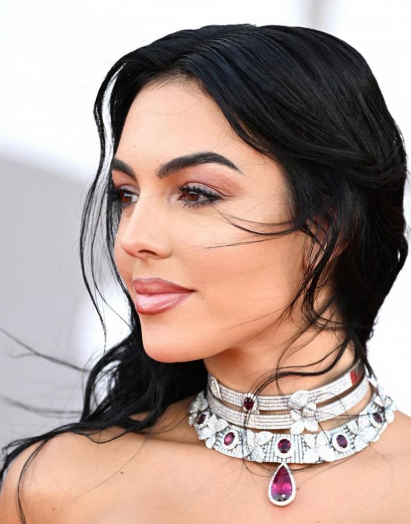 من الناحية الجماليّة، جاءت تسريحة جورجينا بلمسة مزيّن الشعر @serpiente.es بالنمط المموّج بأسلوب عفوي، فيما أبرز خبير التجميل Fer Martinez جمال ملامحها بألوان برونزيّة، مع كحل مائي أسود وماسكارا سوداء، وأحمر شفاه بلون البيج الحيادي، تمّ تغليفه بطبقة من ملمّع شفاه صدفي اللون، بعد تحديد الشفتيْن بقلم كونتور بُنّي.