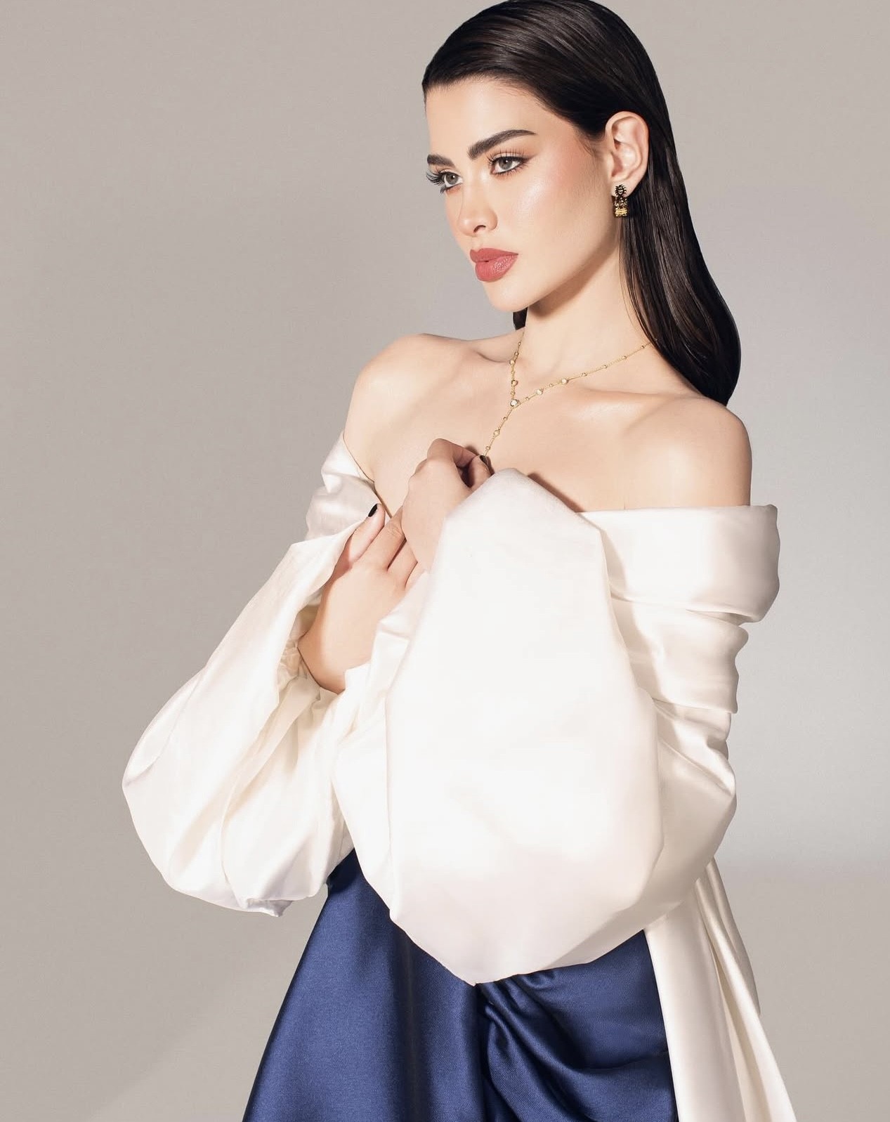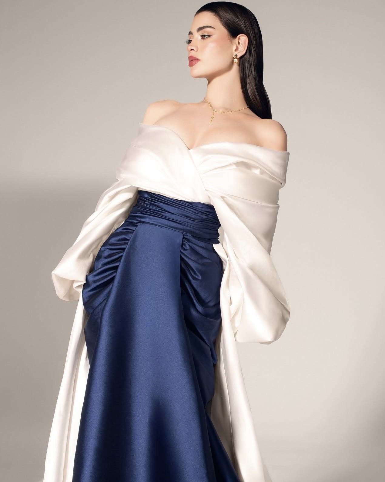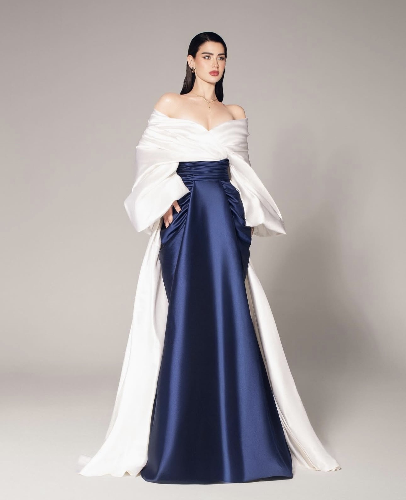 وفي إطلالة لا تقلّ أناقة وروعة عن الأولى، ارتدت روان تصميماً مبتكراً من المصمّم المتجدّد سعيد قبيسي، جمع بين تنّورة مزدوجة من التفتا بلون الأوبال الأزرق، مميّزة بقصّة طويلة مستقيمة، يبرز في أعلاها عند الخصر المنحوت والجيبين الواسعين تفصيل الزمزمة، وهي مقرونة مع "توب" من التفتا الأبيض العاجي مكشوف الكتفين وبتفصيل الثنيات مع كُمّين طويلين واسعين ومجموعين عند الأطراف. يكتمل الزي بقطار من التفتا بلون الـ "توب"، طويل ينسدل على طول التنورة من الخلف، ما يضفي لمسة من الأناقة على هذه الصورة الظليّة الرائعة. كذلك، تزيّنت روان بقلّادة مبهرة من "سواروفسكي" Swarovski، وقرطي أذنين من علامة "بالعربي" Bil Arabi من تصميم نادين قانصو.