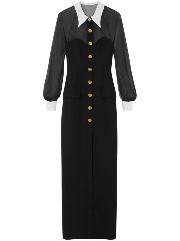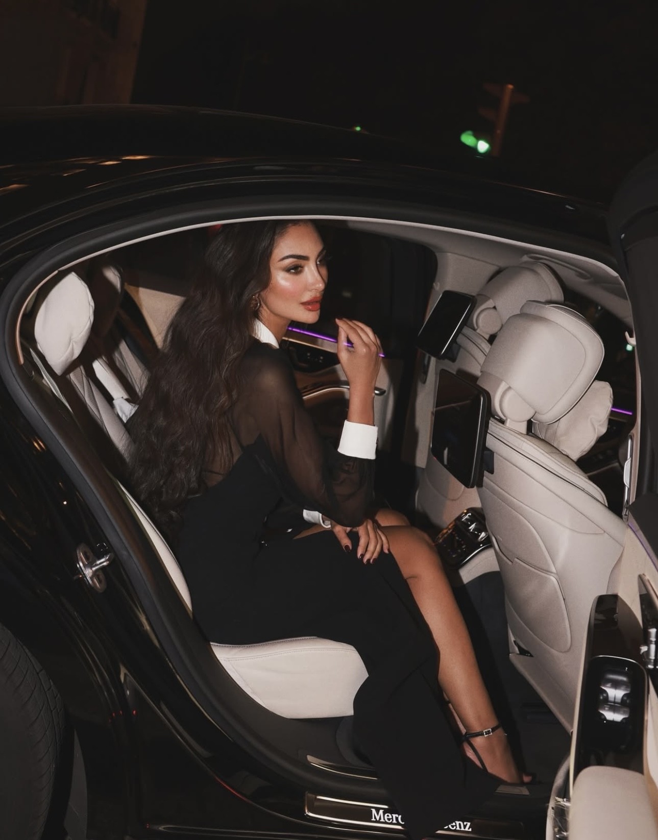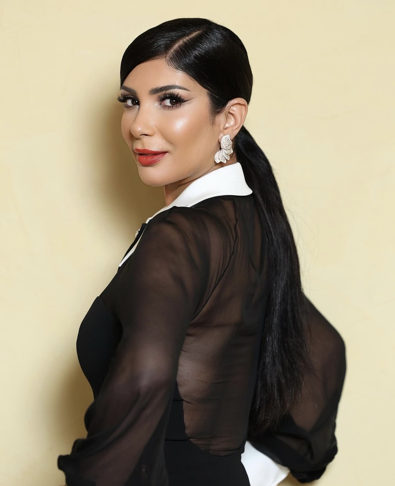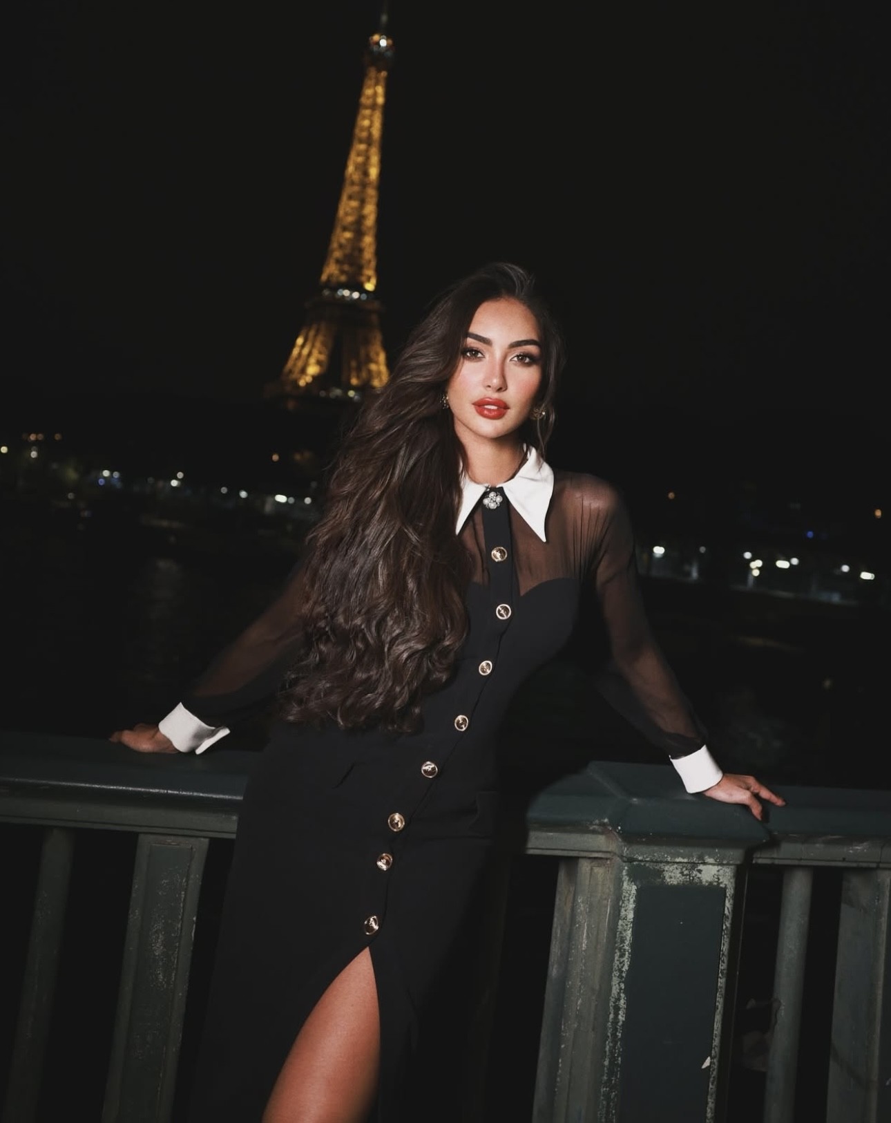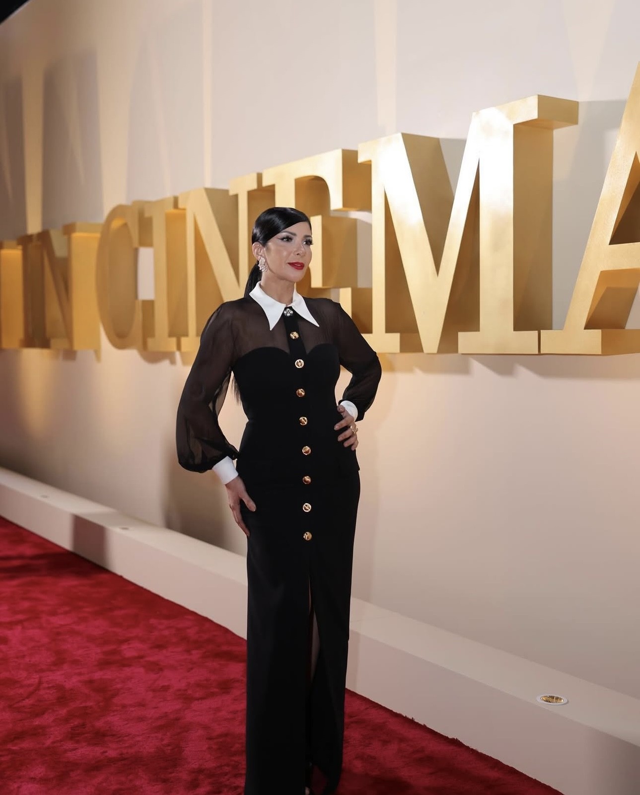 نشرت نور الغندور صوراً لها من عاصمة الموضة باريس بفستانٍ من حرير الـ "كادي" أسود اللون بأزرار ذهبيّة نُحت عليها رأس "ميدوسا" الأيقوني لدار "فرساتشي" Versace الإيطاليّة العريقة Contrast-Collar Silk Cady Bustier Gown بقيمة 5,995$، وهو بجيبين بارزين، وشقّ طويل يكشف الساقين من الأمام، وياقة قميص بيضاء مزيّنة بإكسسوار منمّق باللؤلؤ الأبيض وحبيبات الستراس. تميّز الفستان بقصّة طويلة تعانق الجسم وكُمّين طويلين شفّافين ينتهيان بتفصيل أبيض، كما أن ظهره المكشوف مغلّف بنسيج شفّاف كالذي يغطي الصدر والكُمّين. كذلك، زيّنت نور أذنيها بقرطين مدوّرين من علامة الفستان، وانتعلت صندلاً مفتوحاً أسود اللون بكعبٍ رفيعٍ شاهق. ولإتمام إطلالتها تركت شعرها ينسدل بنمط التموّجات العريضة مع فرق جانبي، وطبّقت مكياجاً طغت عليه اللمسات البرونزيّة مع أحمر شفاه مرجاني.