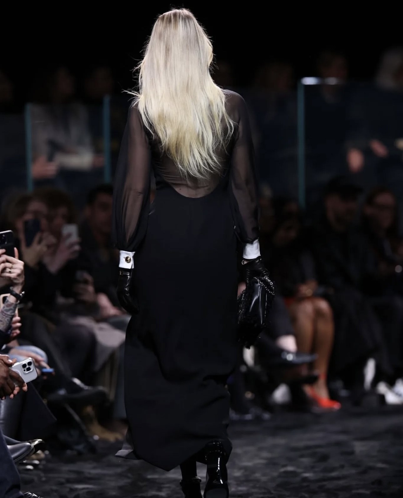 العارضة العالميّة جيجي حديد كانت أول من عرض الفستان في عرض مجموعة الملابس الجاهزة لعام 2024 لدار "فرساتشي" Versace، ونسّقت الفستان بقفّازين قصيرين من الجلد الأسود، وحملت حقيبة يد كبيرة من التويد الأسود مزيّنة بإكسسوارات معدنيّة. كذلك، انتعلت جيجي كندرة مدبّبة من الجلد اللمّاع بتفصيل يعانق الكاحل مزيّن بإكسسوار "ميدوسا" يحاكي نمط قرطي أذنيها. وتركت جيجي شعرها منسدلاً مع فرق في الوسط، واعتمدت مكياج العينين الغرافيكي مع أحمر شفاه حيادي اللون.
