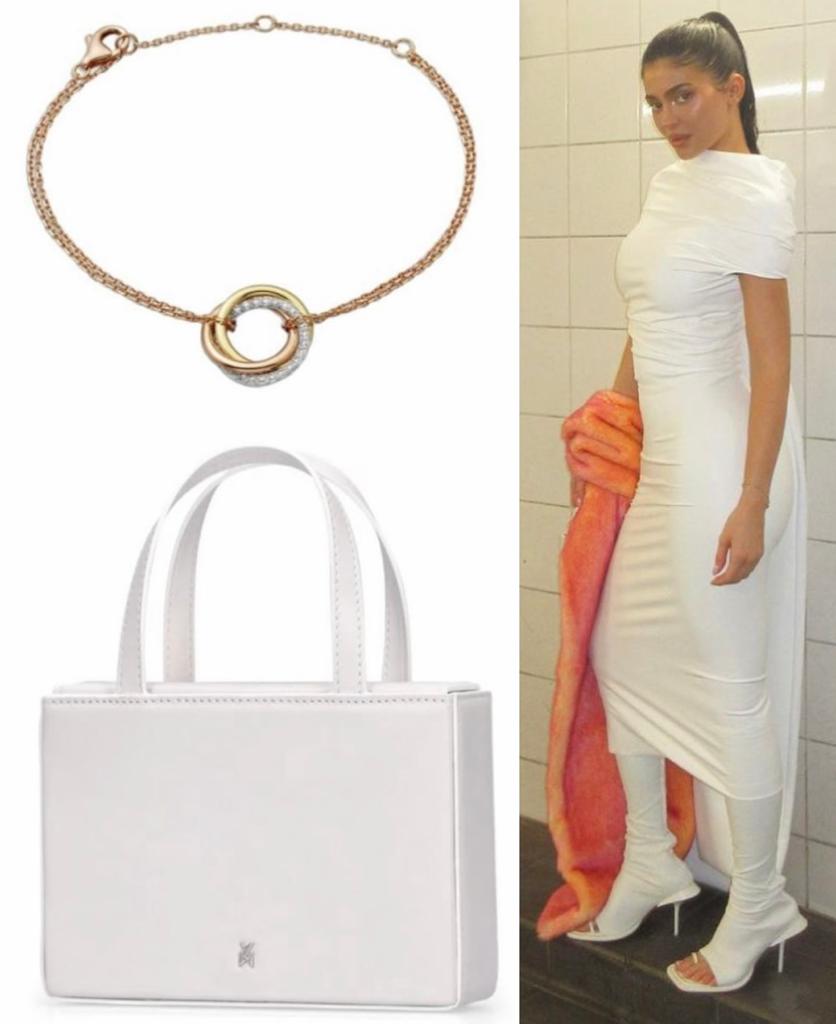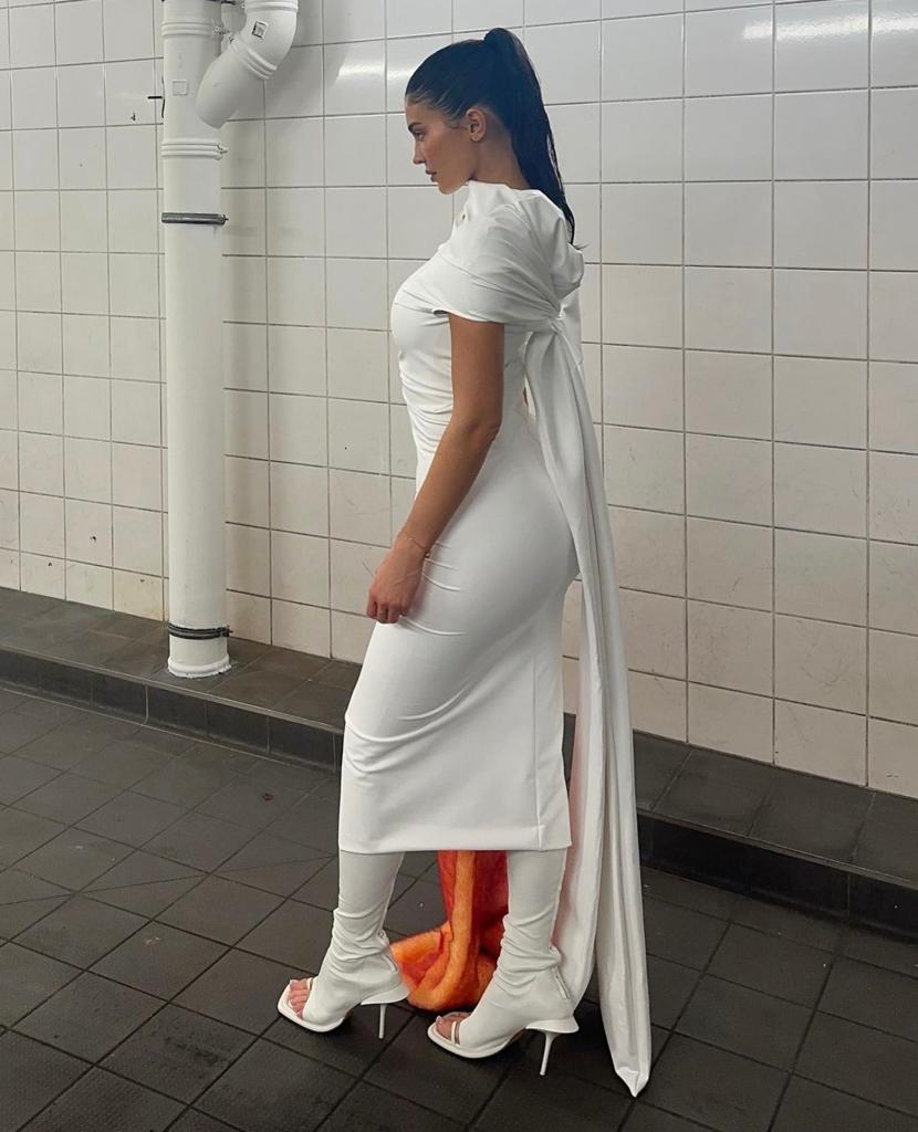 وكانت كاميرات الباباراتزي قد رصدت إحدى إطلالات كايلي في باريس بفستان أبيض أنيق جداًLook 49 من Sportmax لربيع وصيف 2024، مميّز بقصّة ضيّقة معتدلة الطول وتفصيل يلف القسم العلوي من الجسم ومعقود خلف الظهر حيث ينسدل ملامساً الأرض، وقد أقرنته مع رداء كتفيْن من الفرو الصناعي برتقالي اللون، كما انتعلت جزمة طويلة ومفتوحة من الجلد الأبيض من العلامة نفسها، وحملت حقيبة يد Amini Giorgia Top Handle Bag بقيمة 875$ من Amina Muaddi، وزيّنت يدها بسوار Trinity Bracelet بقيمة 3,050 من Cartier.