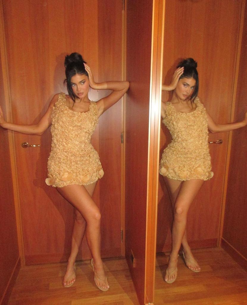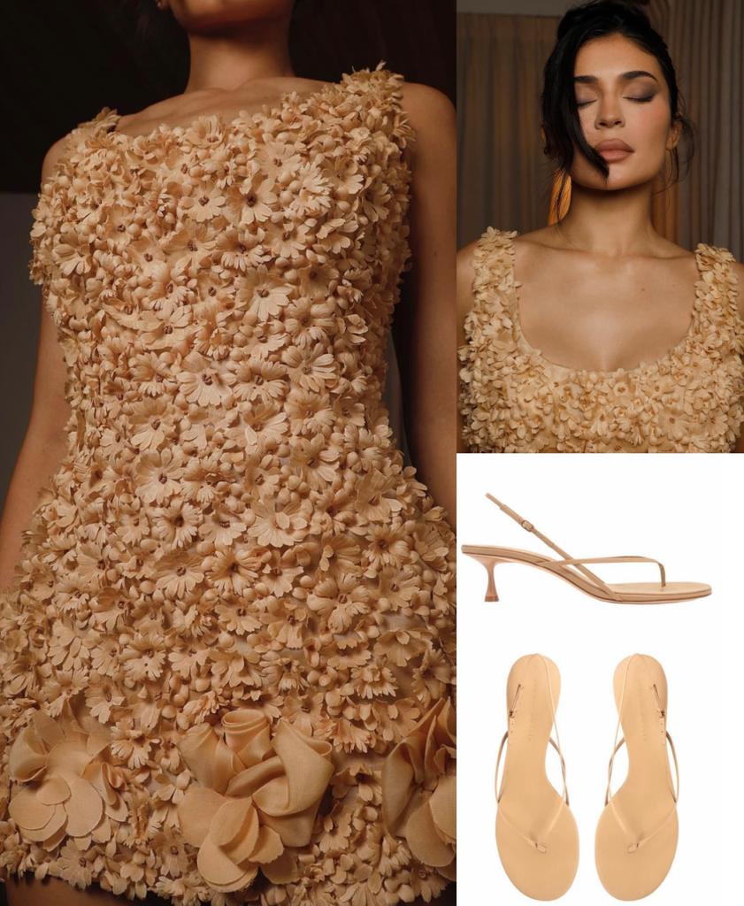 ومن اختيارات كايلي المميّزة أيضاً، تأنّقها بفستانٍ قصيرٍ جداً بدون كُمّيْنA-Line Mini Dress من مجموعة قديمة لدار Prada، يعود تصميمه لموسميْ ربيع وصيف 1992 بتوليفة أزهار صغيرة من الأورغانزا، وانتعلت صندلاً بإصبع Wishbone 50 Heel من الجلد بلون البيج الحيادي من Studio Amelia بقيمة 343$.
