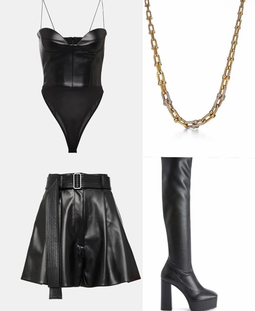 إطلالة شاكيرا جاءت بطقمٍ متكامل من الجلد الصناعي، شمل "بودي سوت" من دون كُمّيْن مكشوف الصدر والظهر Halston Faux Leather Bodysuit بقيمة 905$، أقرنته مع سروالٍ بنمط التنّورة قصير جداً وواسع، بتفصيل الثنيات وسحّاب مع حزامٍ يحدّد الخصر Pleated High Waist Pace Shorts بقيمة 905$ وكلاهما من علامة Alex Perry.