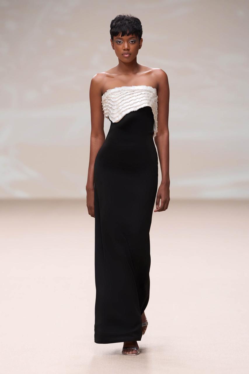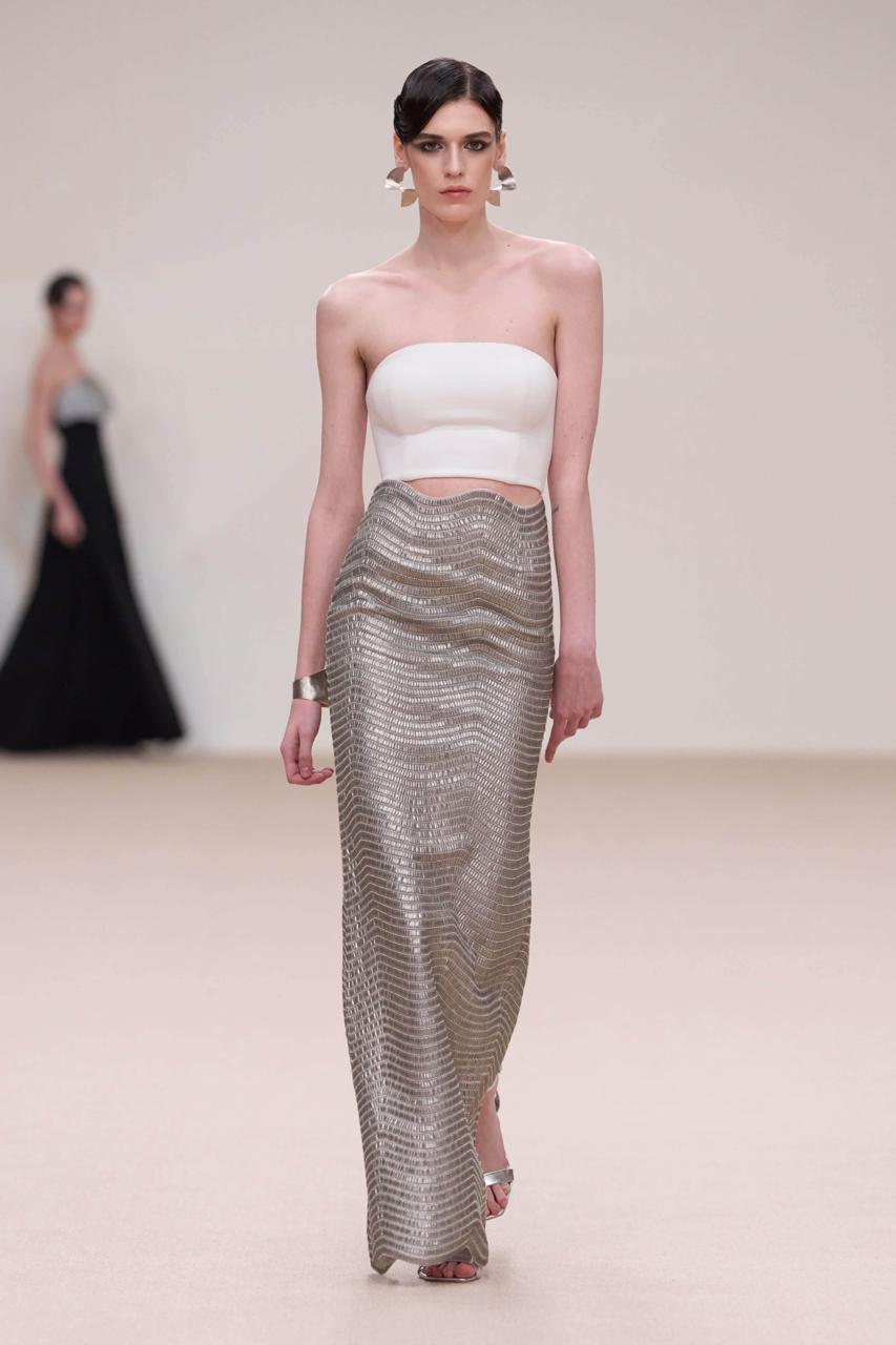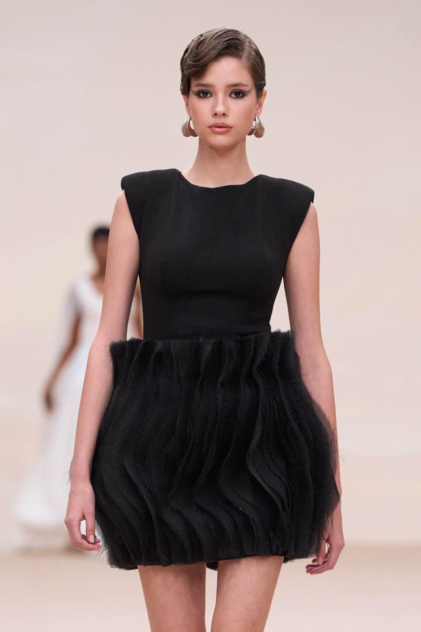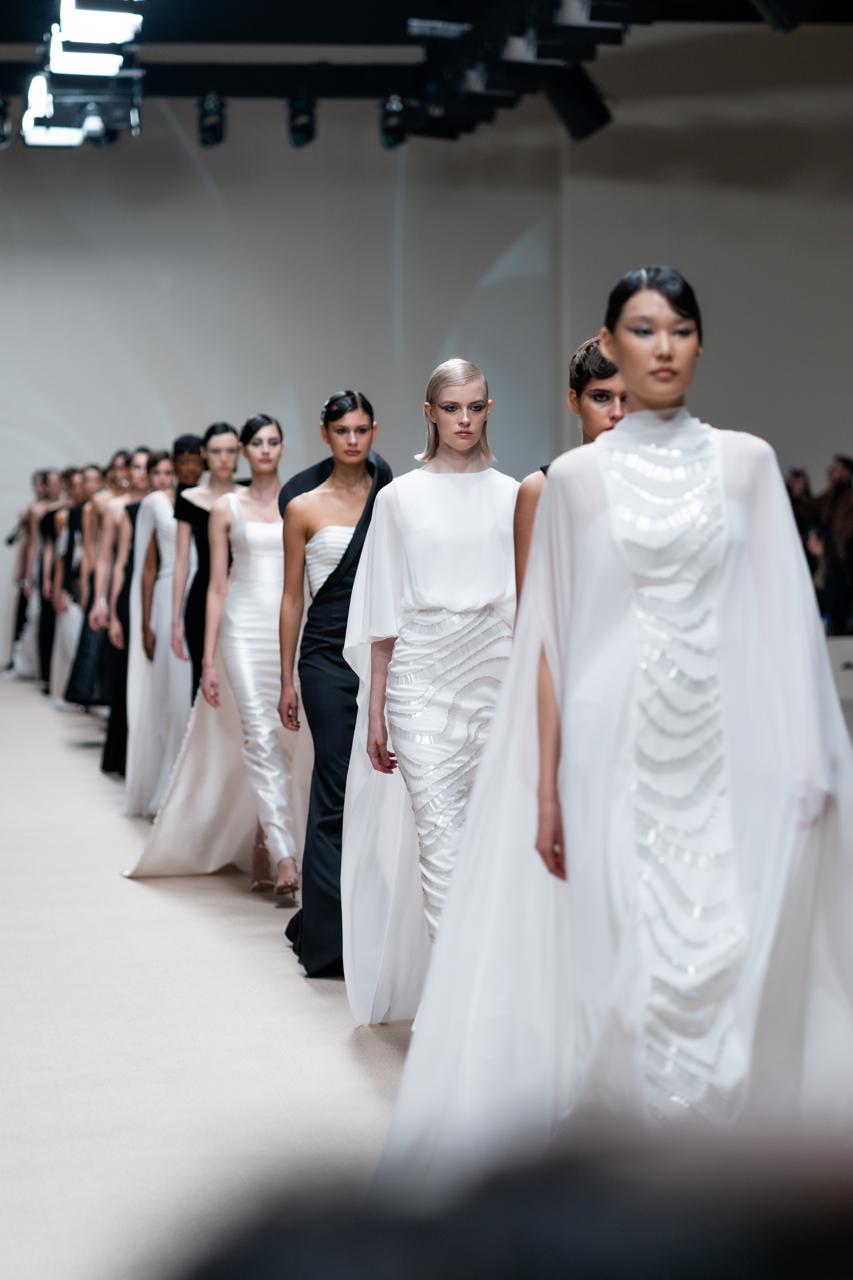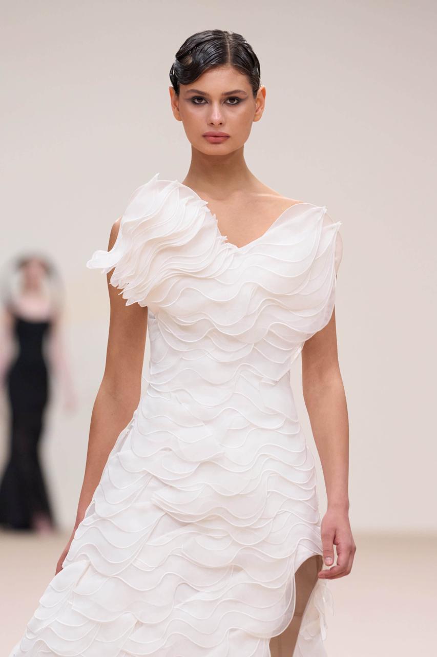 لخلق توازن ما بين القوة والنعومة، اختارت الدار مجموعة أقمشة مترفة مثل السكوبا، الشيفون، التافتا، الأورغانزا، والمخمل، ممّا يمنح التصاميم بعدًا فنيًا ينبض بالحياة. أما لوحة الألوان، فجاءت متناغمة مع الجمال الهندسيّ للمبنى الشهير، حيث تتألق المجموعة بدرجات الأبيض، الأسود، الرمادي، والفضي، التي تبرز تفاصيل كل قطعة بأسلوب راقٍ وأنيق.