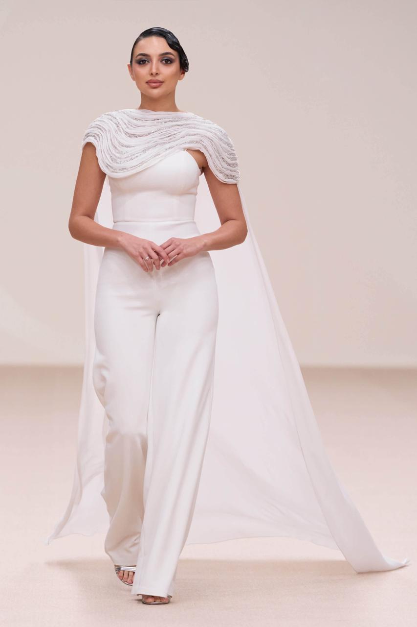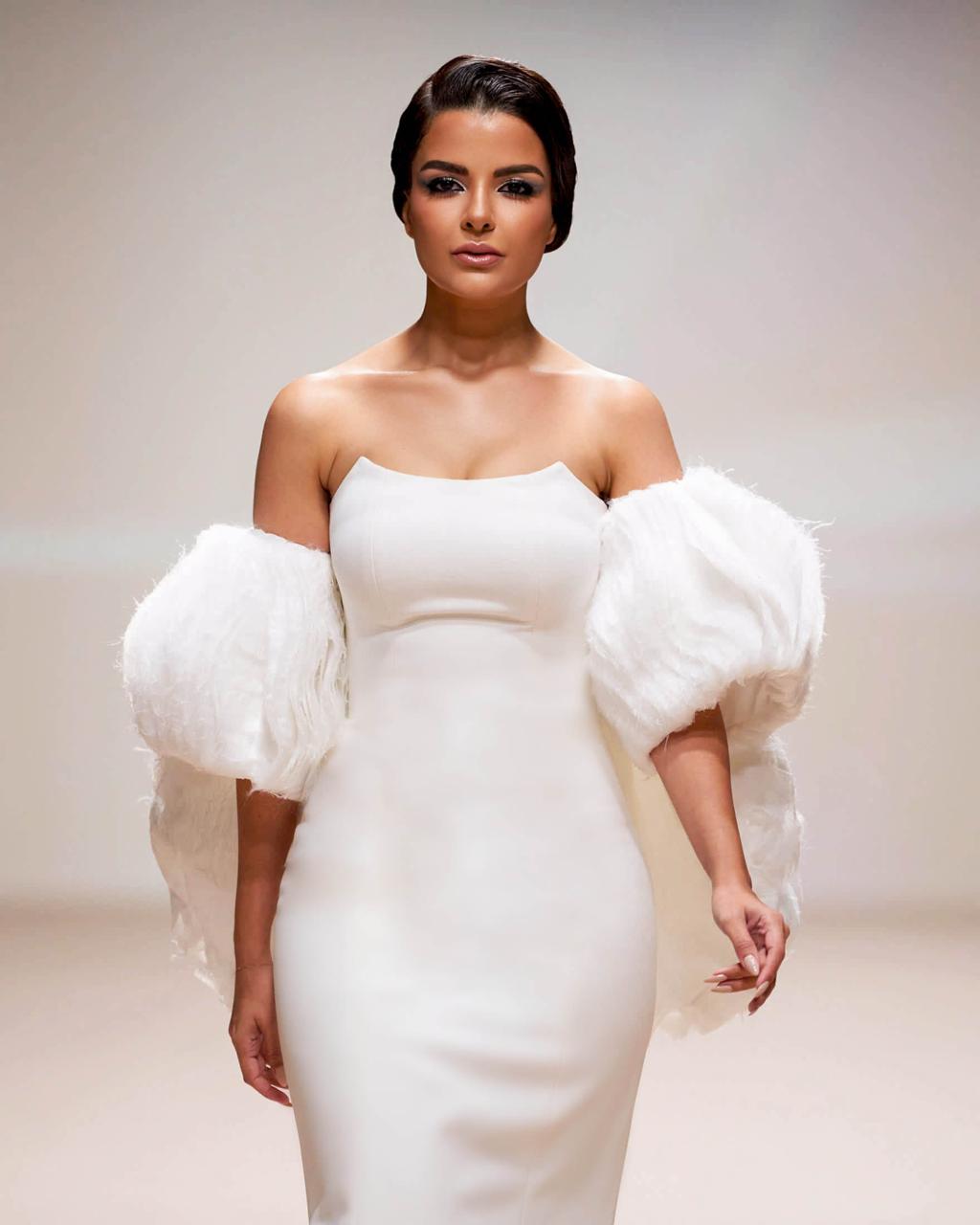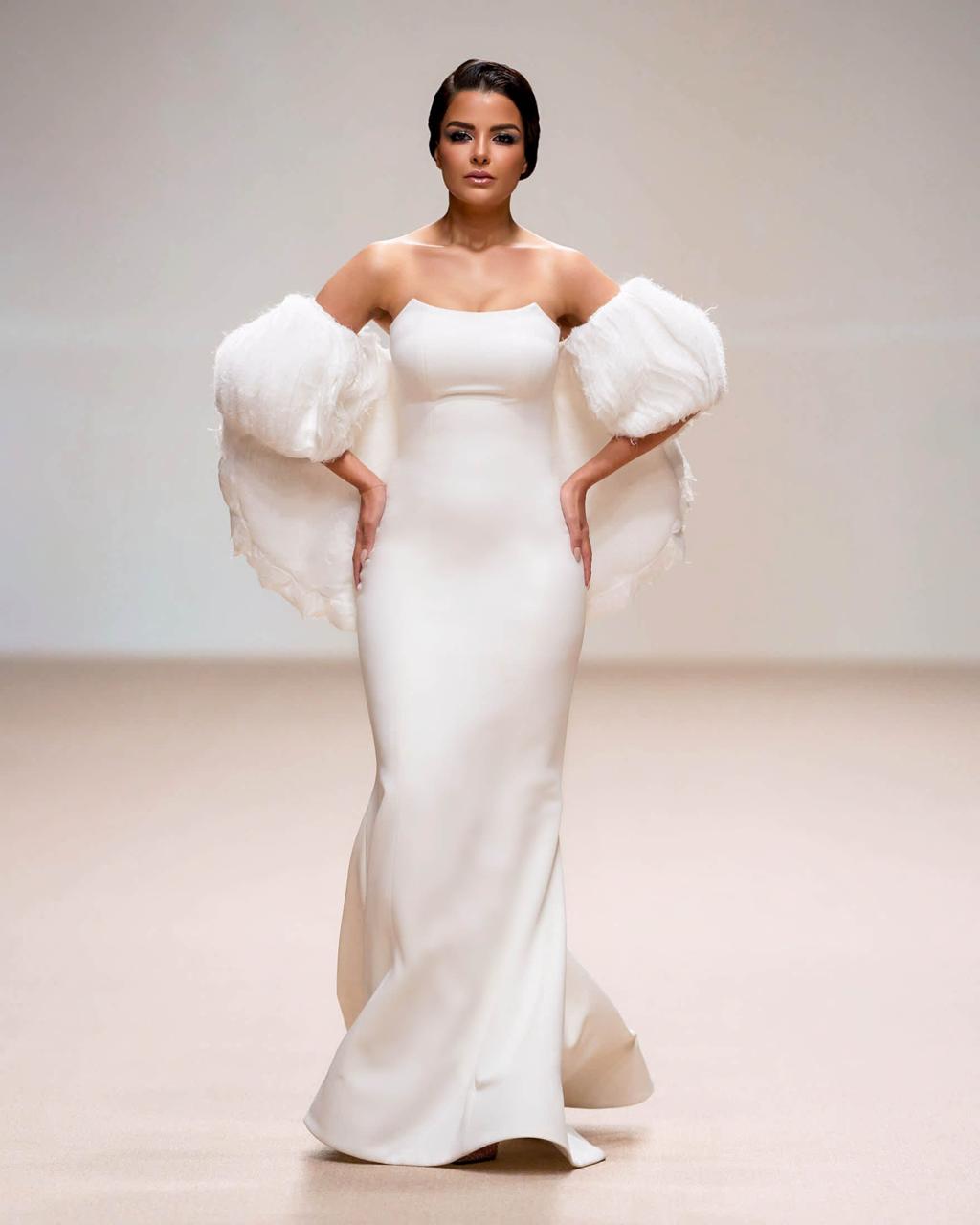افتتح العرض بإطلالة مميّزة للمخرجة والمنتجة سارة عبدالله بفستانٍ أبيض يجسّد رؤية الدار للمرأة العصريّة القويّة.