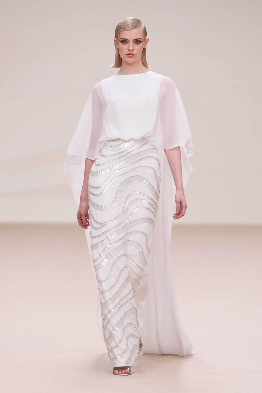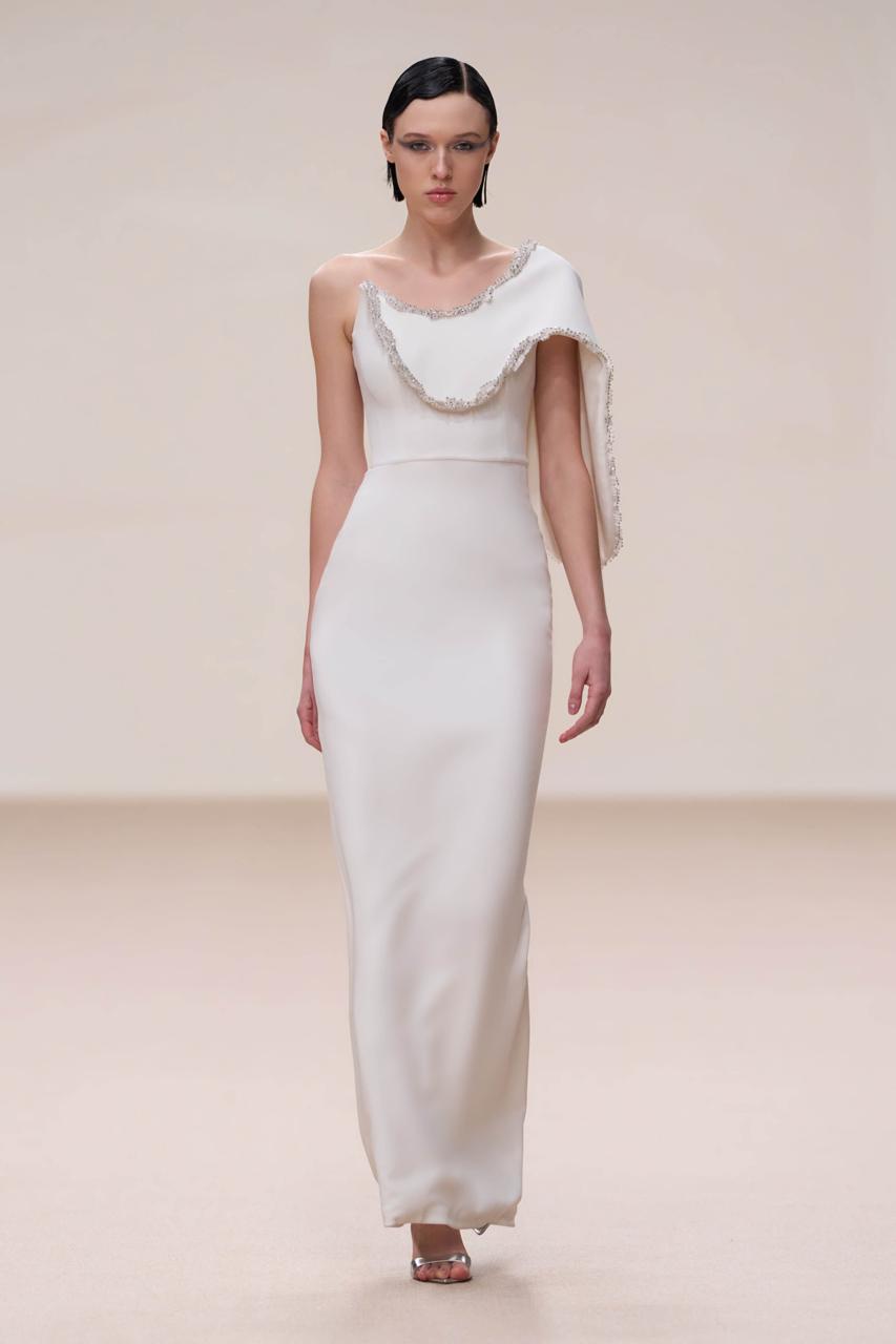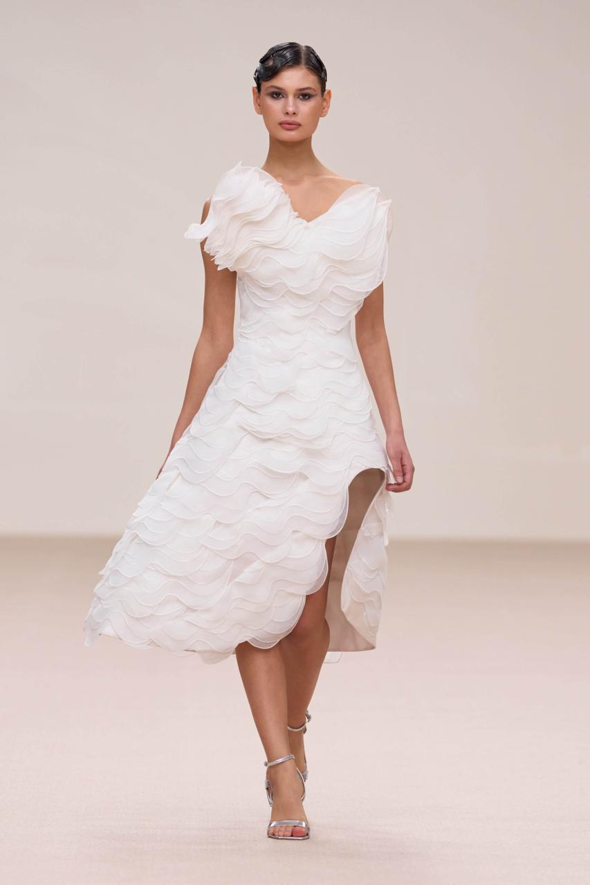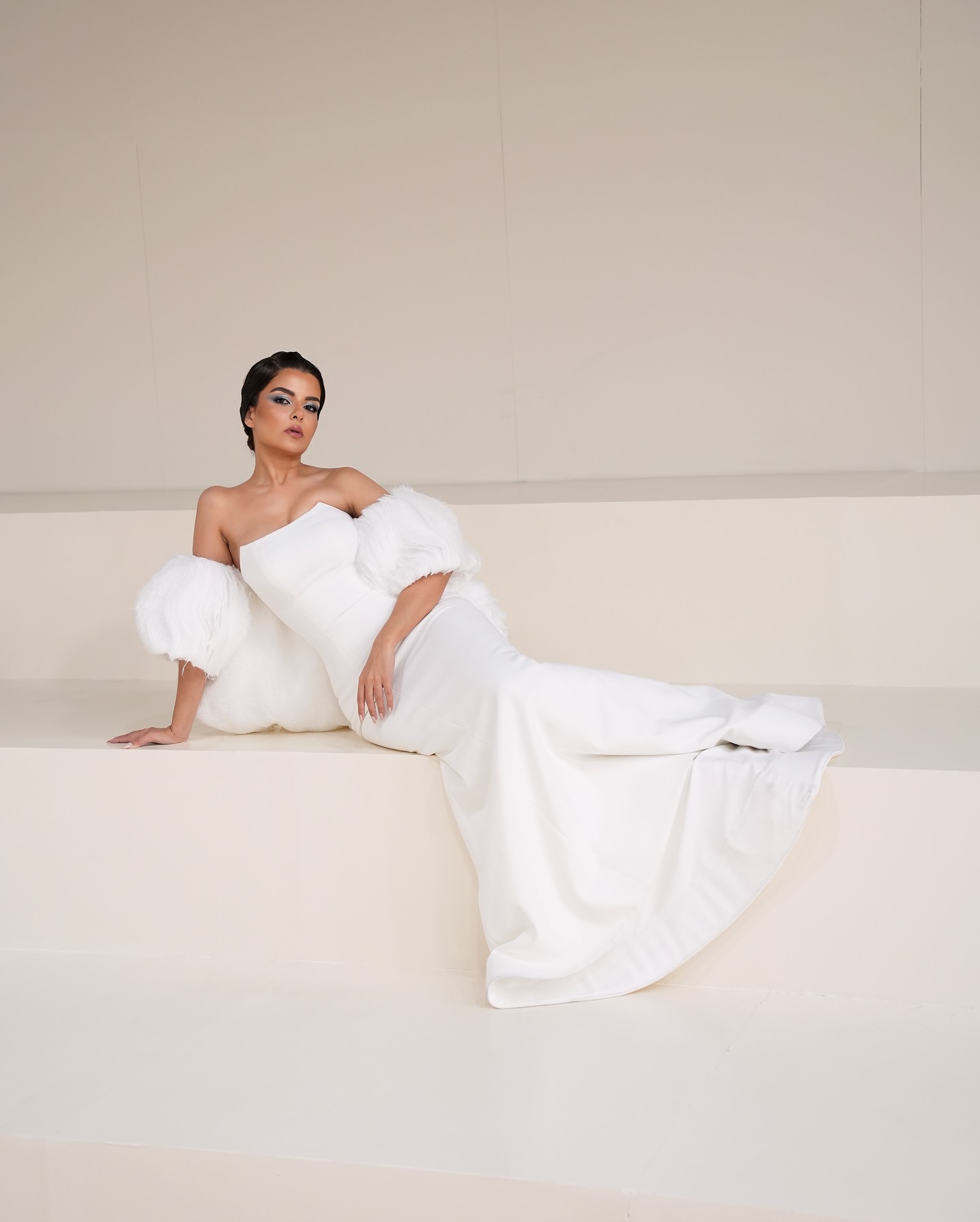 افتتح العرض بإطلالة مميّزة للمخرجة والمنتجة سارة عبدالله بفستانٍ أبيض يجسّد رؤية الدار للمرأة العصريّة القويّة.