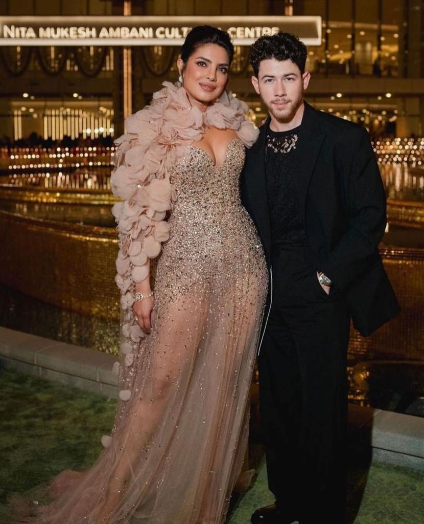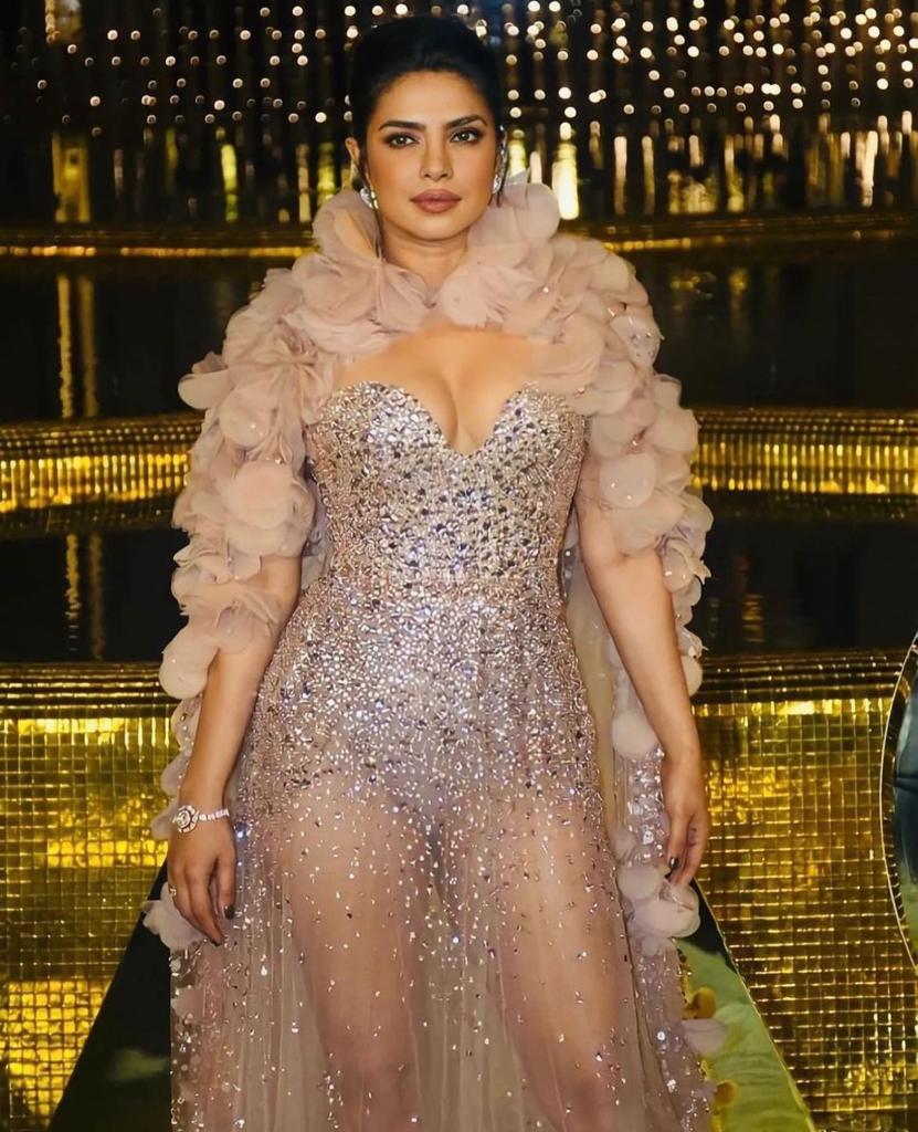 بدورها بريانكا شوبرا سرقت الأضواء بتصميم مغرٍ أطلّت به في افتتاح المركز الثقافيNita Mukesh Ambani Cultural Center في مومباي، اختارته من مجموعة الخياطة الراقية لخريف وشتاء 2022، يجمع بين نمط الـ"بودي" بدون حمّالات ونسيج الشيفون الشّفاف، مطعّم بأحجار السواروفسكي والخرز والترتر الفضّي والبرونزي البرّاق، وهو مقرونٌ مع رداء كتفيْن بياقة منتصبة من الشيفون المطرّز بتوليفة كشاكش تشبه بتلات الورود. كذلك، تزيّنت شوبرا بمجوهرات من BVLGARI، وانتعلت صندلاً ذهبياً فاتحاً بمنصّة ضخمة وكعبٍ شاهق.