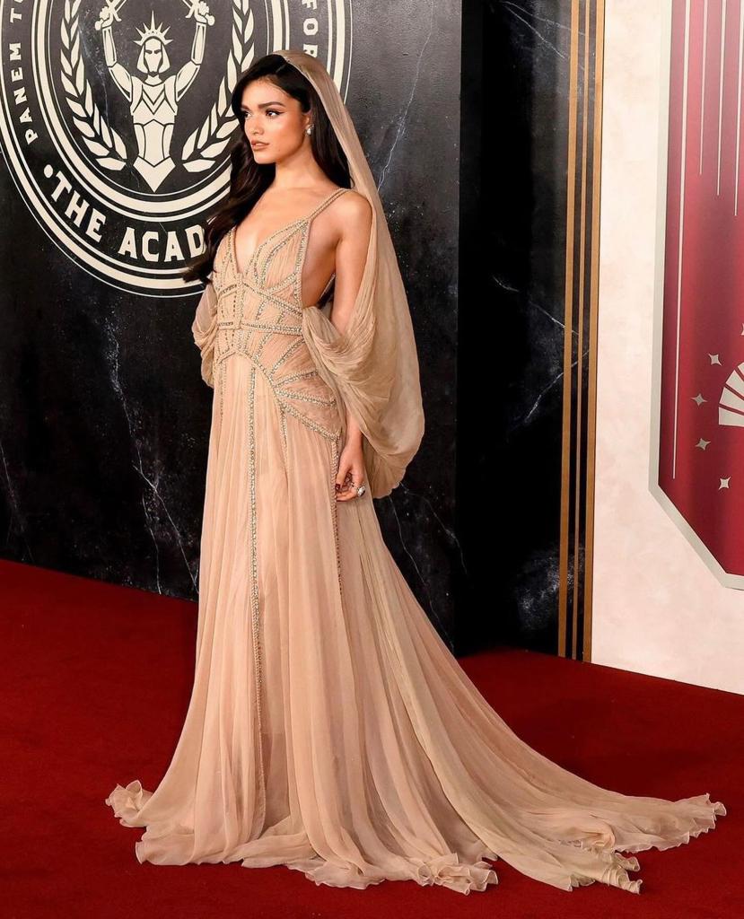 أمّا راشيل زيغلر، خلال حملتها الترويجيّة لفيلمها الجديد The Hunger Games: The Ballad of Songbirds & Snakes، فقد ارتدت من إيلي صعب، فستاناً من الشيفون بلون البيج الحيادي المطرّز بالكريستال البرّاق من مجموعة الخياطة الراقية لخريف وشتاء 2023. كما تزيّنت بمجوهرات من Tiffany & Co، وانتعلت صندلاً من علامة Jimmy Choo.
